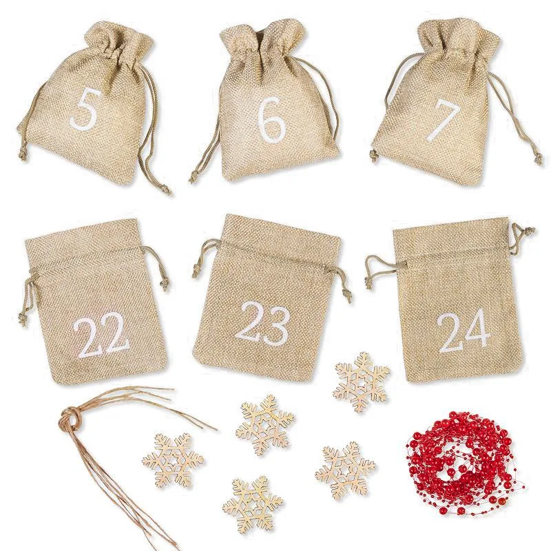 Leder du efter en minimalistisk adventskalender med stofposer i jute-look? Så overvej denne model! Den udmærker sig ved sine afdæmpede, naturlige farver (den består af 24 små poser i jute-stil. Tilgængelig i naturfarve med hvidt tryk og charmerende snefnug af træfiner med stemningsfulde brændemærker) suppleret med et juletouch i form af en guirlande af smukt glitrende røde perler.
