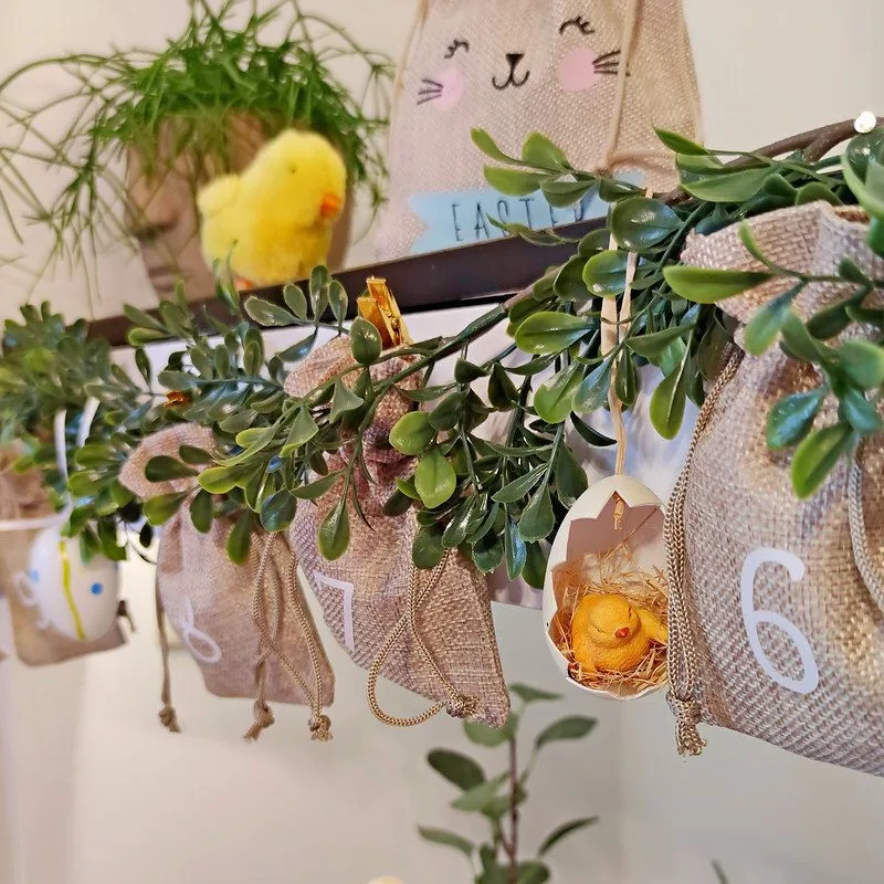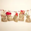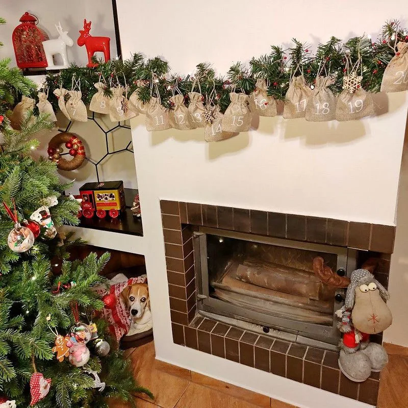 Kalenderen med poserne kan hænges op som en dekorativ juleguirlande over kaminen. Hvis du ikke har en kamin derhjemme, kan du også pakke poserne i en dekorativ æske, hænge dem på juletræets grene eller give de enkelte jute-lignende stofposer fyldt med gaver personligt hver dag!