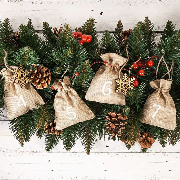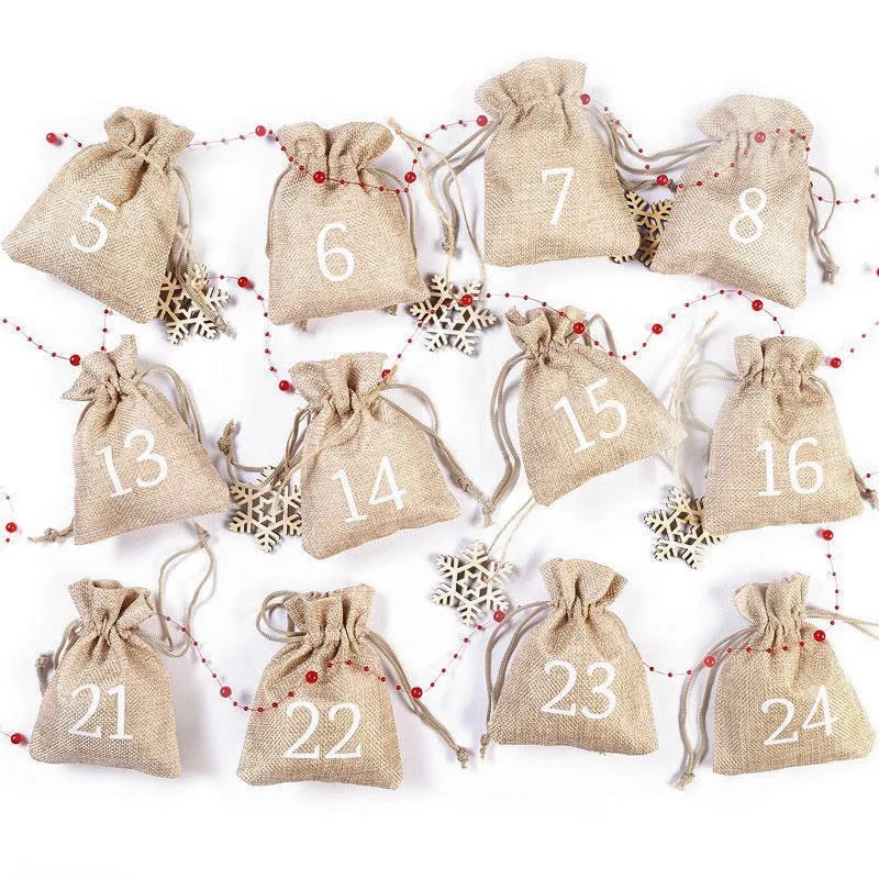 1 stk. Adventskalender juteposer 10 x 13 cm - naturlig + hvide tal