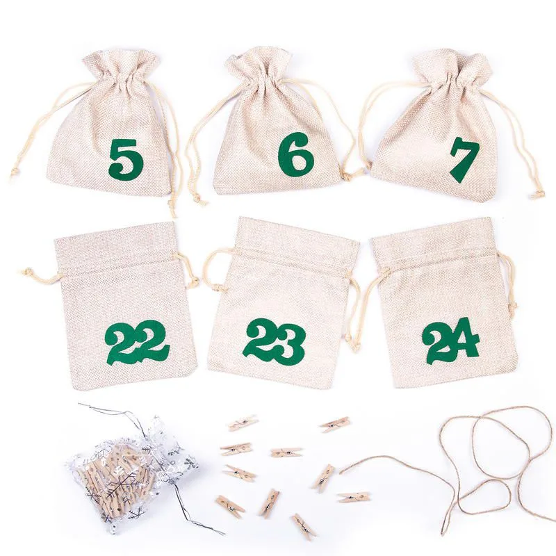 1 stk. Adventskalender juteposer 12 x 15 cm - naturlig lys + grøn tal