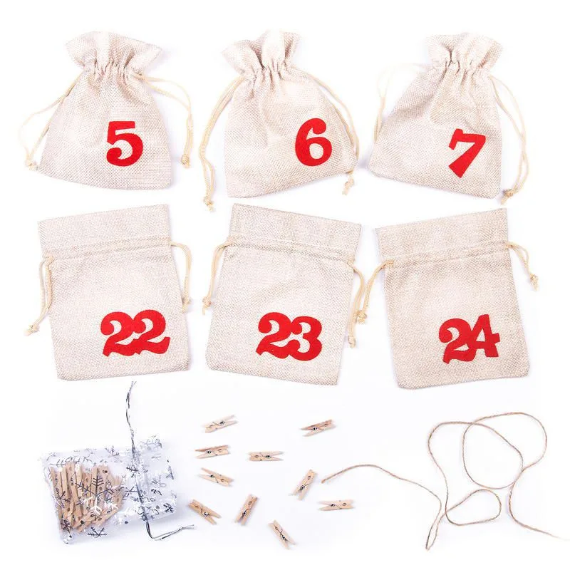 1 stk. Adventskalender juteposer 12 x 15 cm - naturlig lys + rød tal