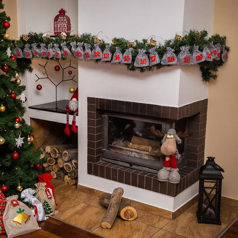 Vi tilbyder et komplet sæt til at forberede en adventskalender i form af en dekorativ guirlande med poser. Det er en vidunderlig dekoration, som kan hænges på væggen eller f.eks. over kaminen.