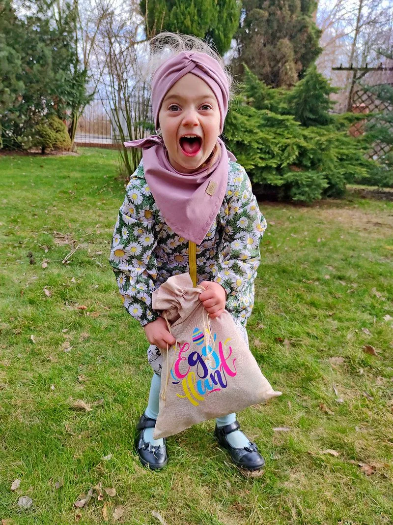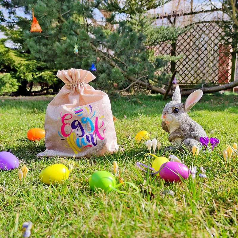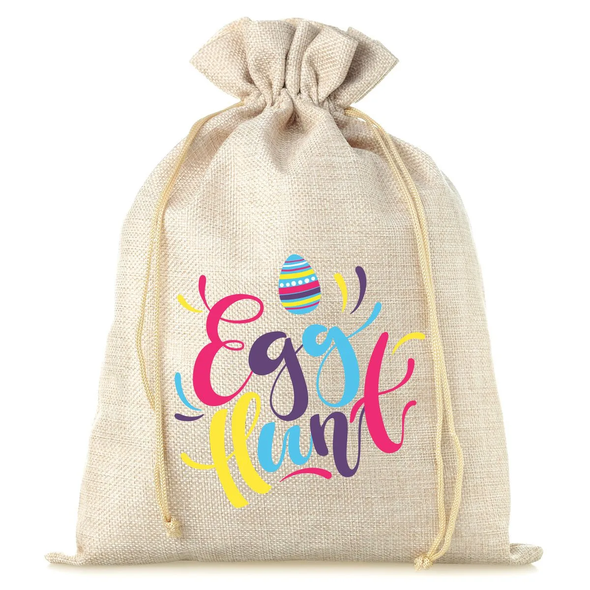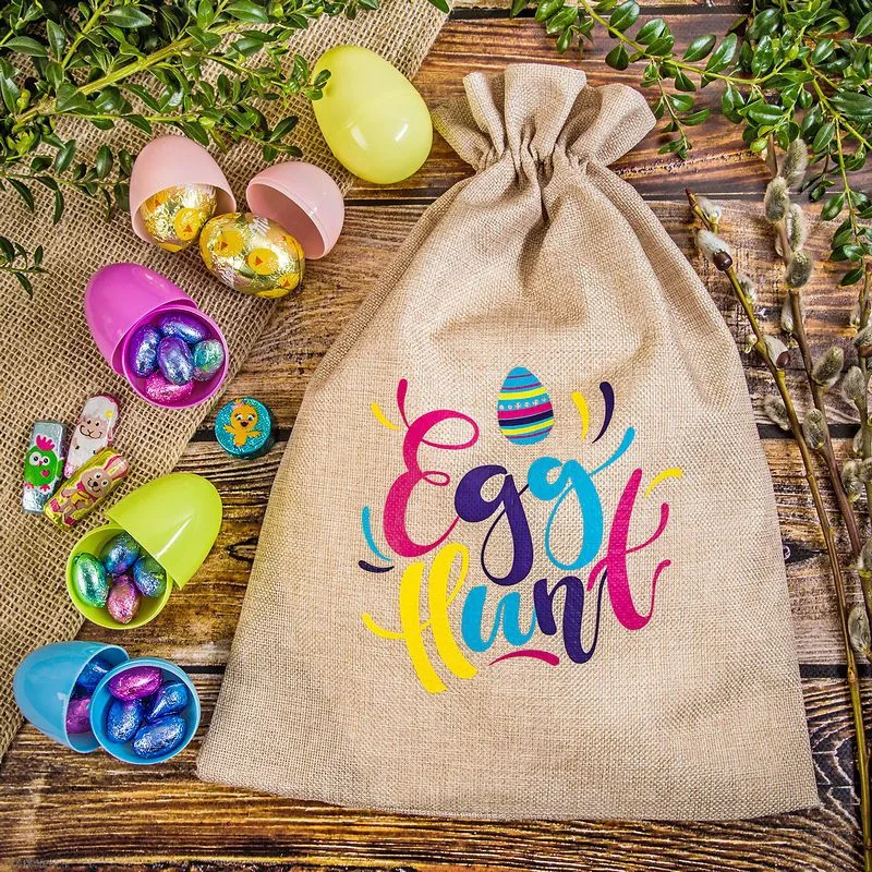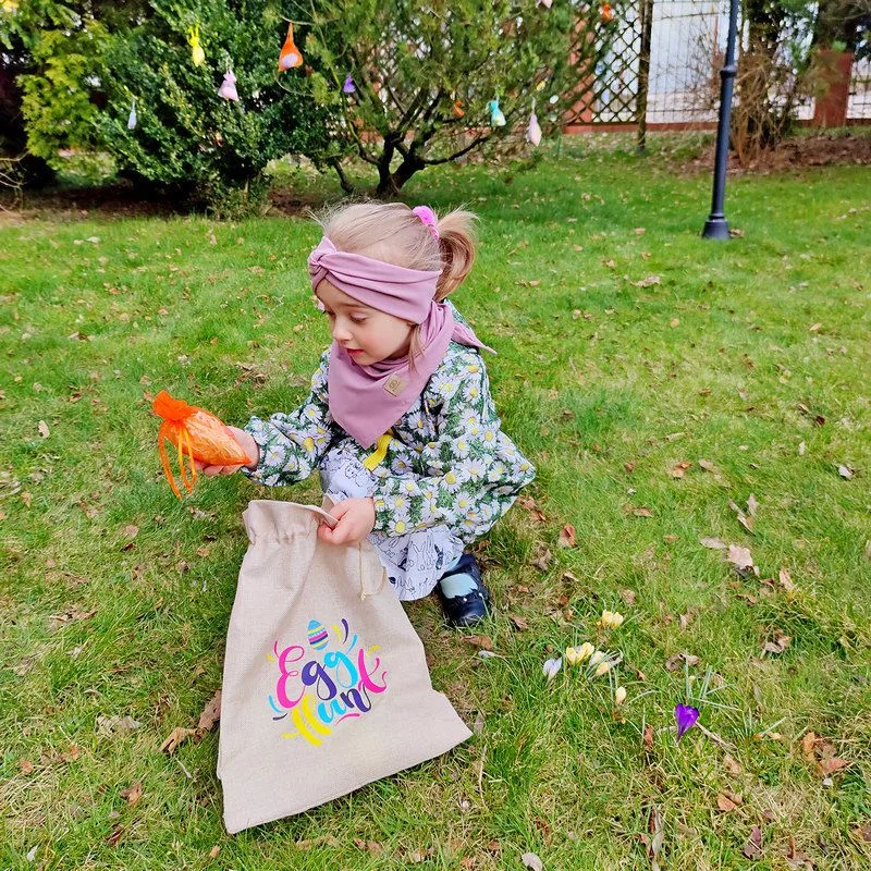 Denne jutepose er dekoreret med et farverigt print, hvor der står "Egg hunt" ( æggejagt). Kender du dette spil? Æggejagt er et påskespil for børn, hvor de skal lede efter farverige påskeæg eller chokoladeæg, der er gemt i haven.