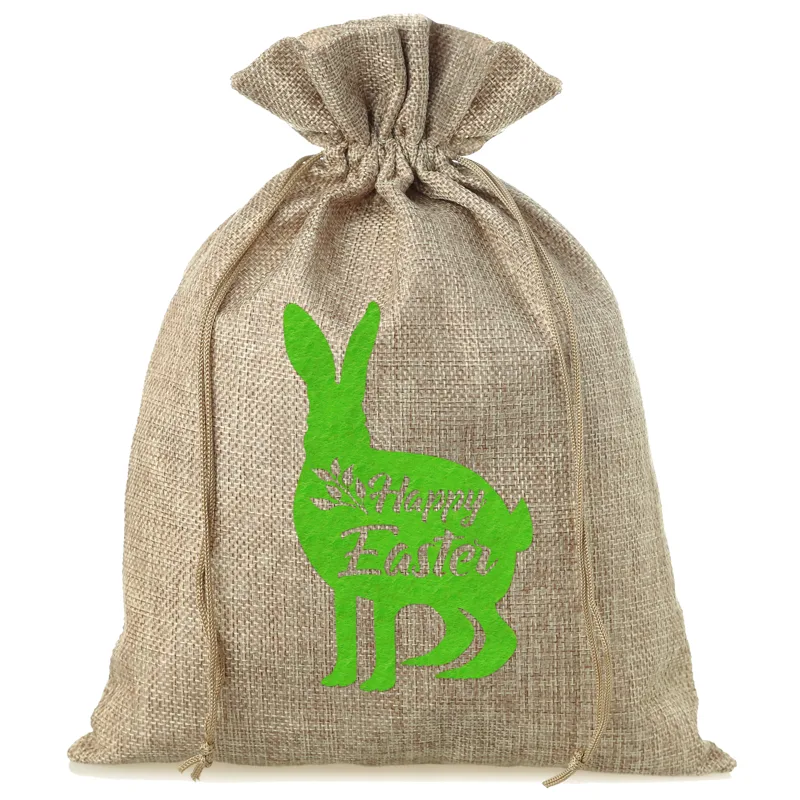 Den store 30 x 40 cm store naturfarvede linnedpose kan nemt rumme en række forskellige påskehare-gaver. De flettede snore i snoren gør det ekstremt nemt at pakke gaver ind.