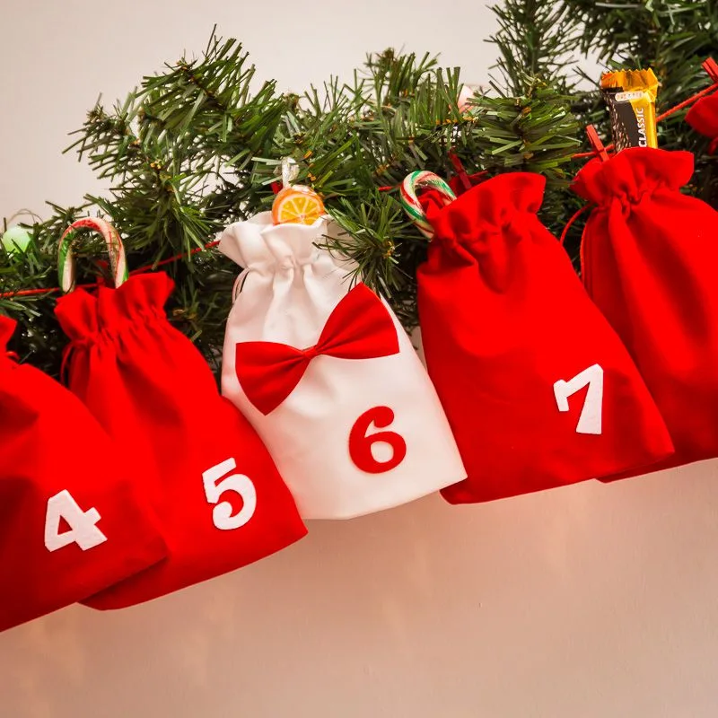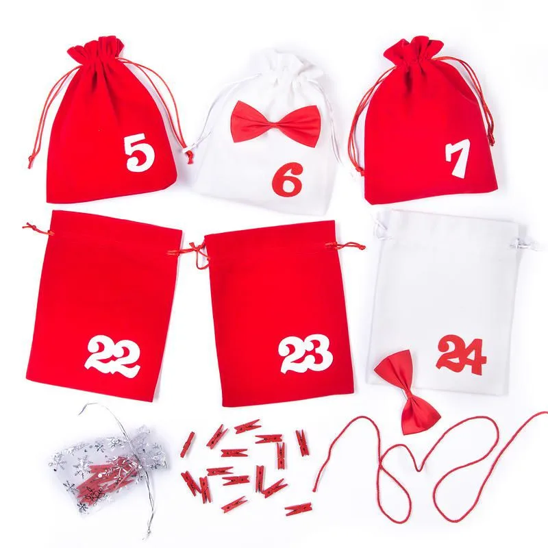 1 stk. Veloursposer til adventskalender 15 x 20 cm - rød og hvid + hvide og røde tal