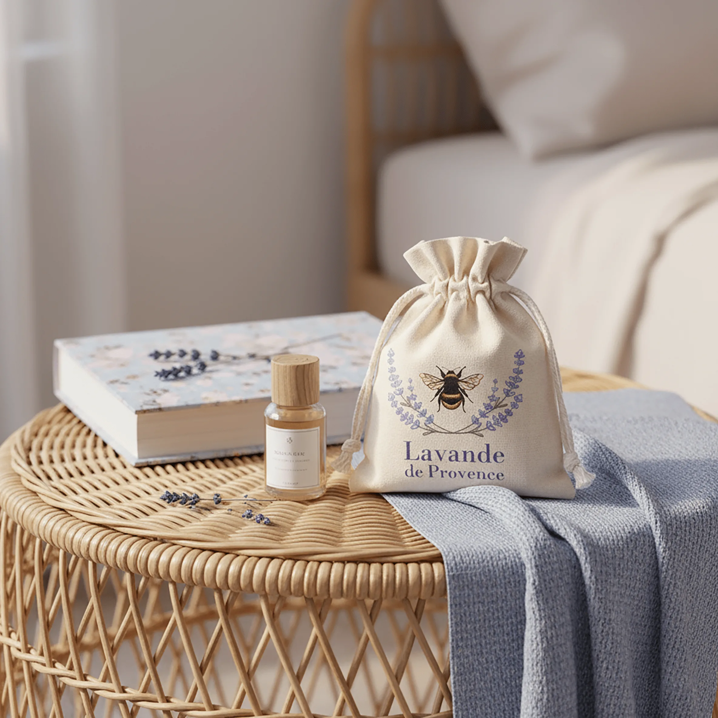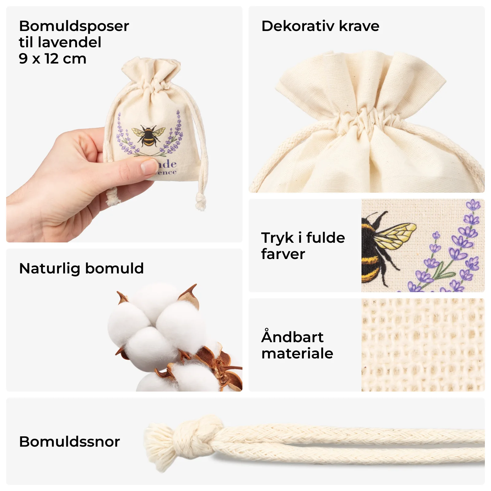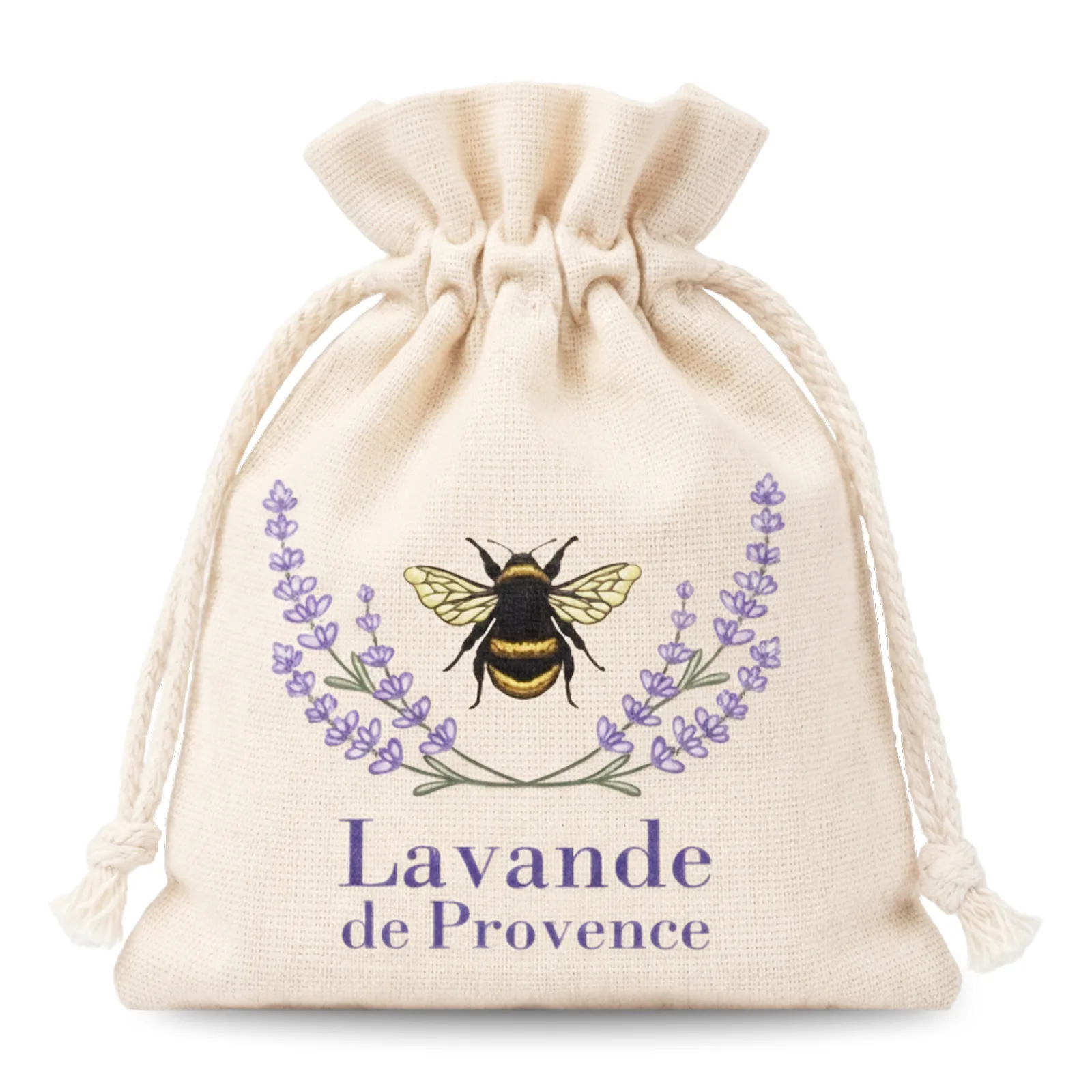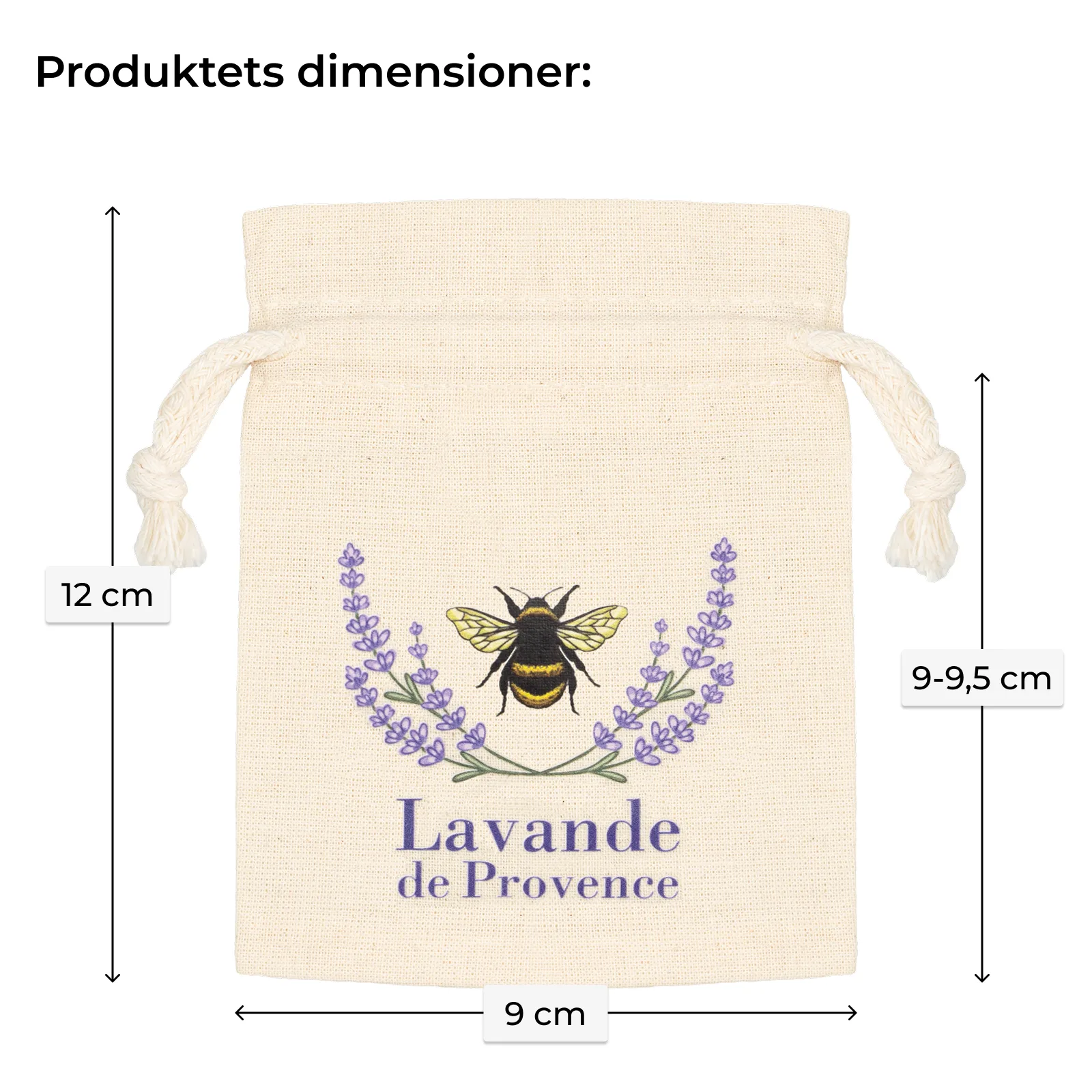 Poserne er syet af 100 % bomuld i en naturlig, lys beige farve. Stoffet har en let struktureret overflade, føles behageligt at røre ved og giver indpakningen karakter af en klassisk Provence bomuldspose. Den neutrale naturfarve fremhæver trykket med lavendel og bi og passer godt til både lavendelprodukter, håndlavet kosmetik og gaveæsker i landlig stil. Den dobbelte bomuldssnor gør det nemt at åbne og lukke posen og gør den velegnet til genbrug og flerbrug.