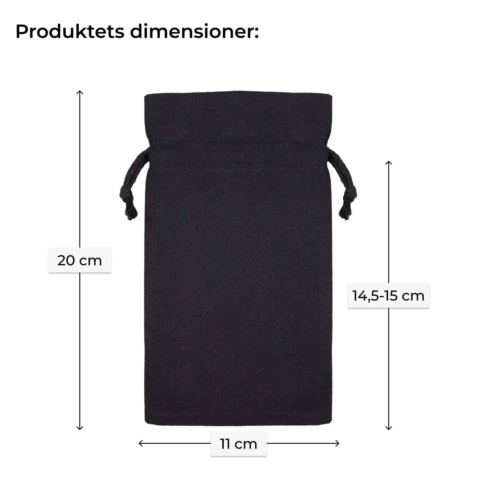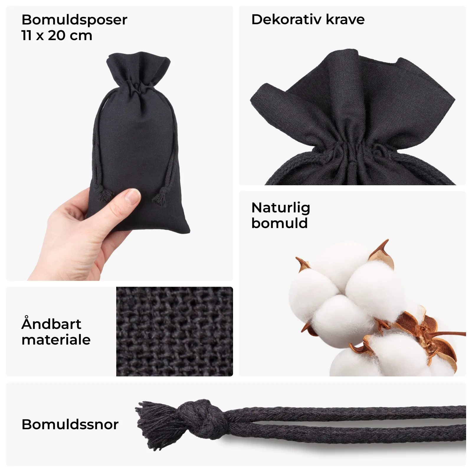 Små, men alsidige poser af elegant bomuld i sort i størrelsen 11 x 20 cm . Pakken, der præsenteres her, består af 10 stk., så et engangsindkøb af de praktiske poser rækker i lang tid.
