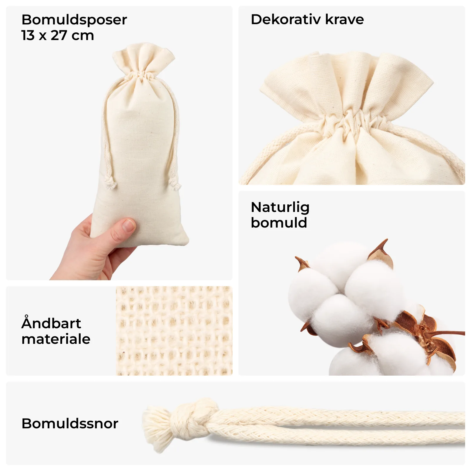 Poserne er perfekte som dejlig gaveindpakning, men de er også lige så gode som emballage til kosmetik, smykker eller stearinlys. Bomuldsposer er også populære hos virksomheder, der søger original emballage til forretningsgaver.