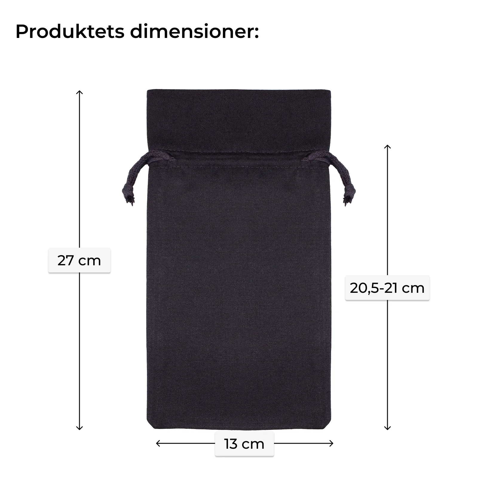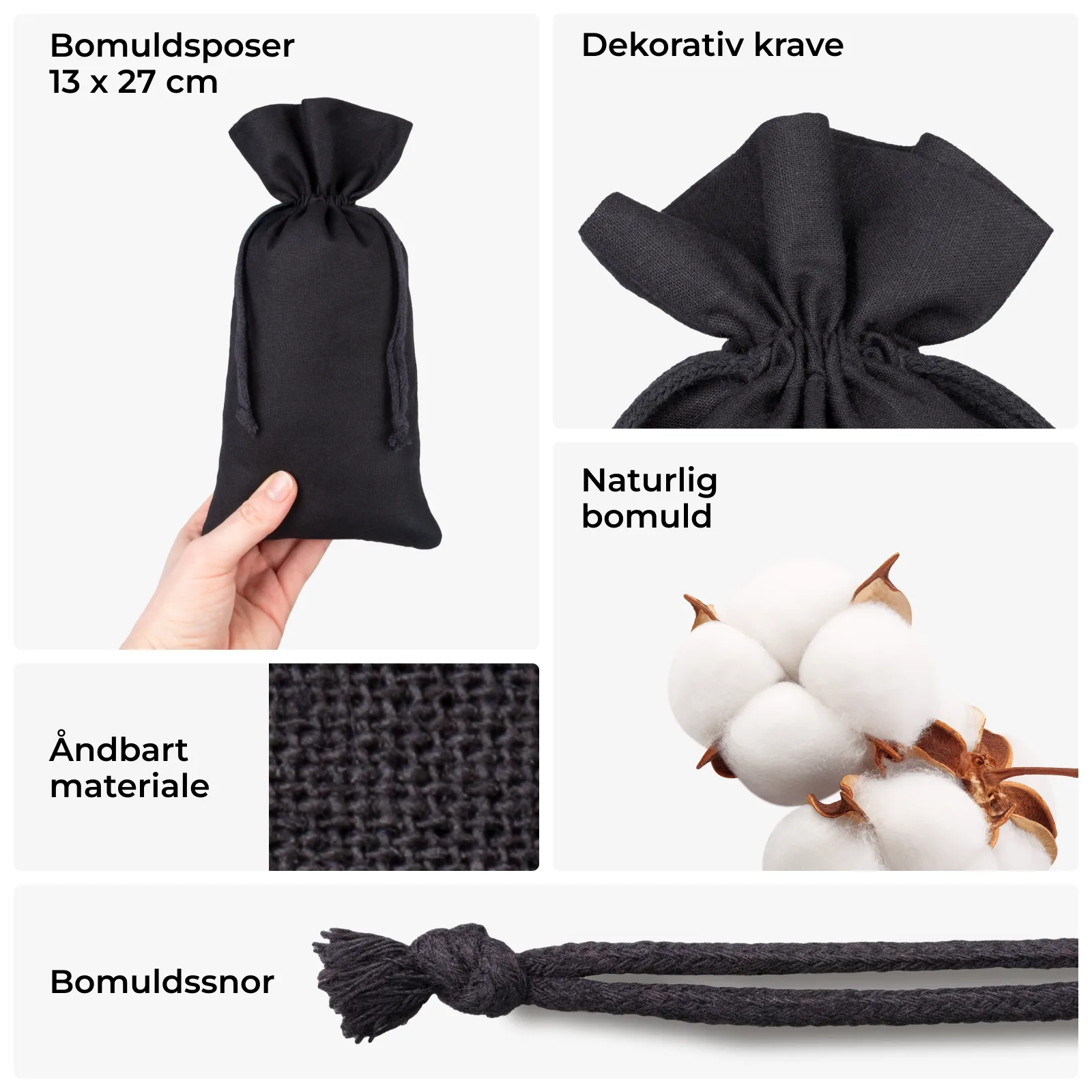 De små, men universelt anvendelige poser er fremstillet af elegant bomuld i sort og måler 13 x 27 cm . Pakken, der præsenteres her, består af 10 stk., så et engangsindkøb af de praktiske poser rækker i lang tid.