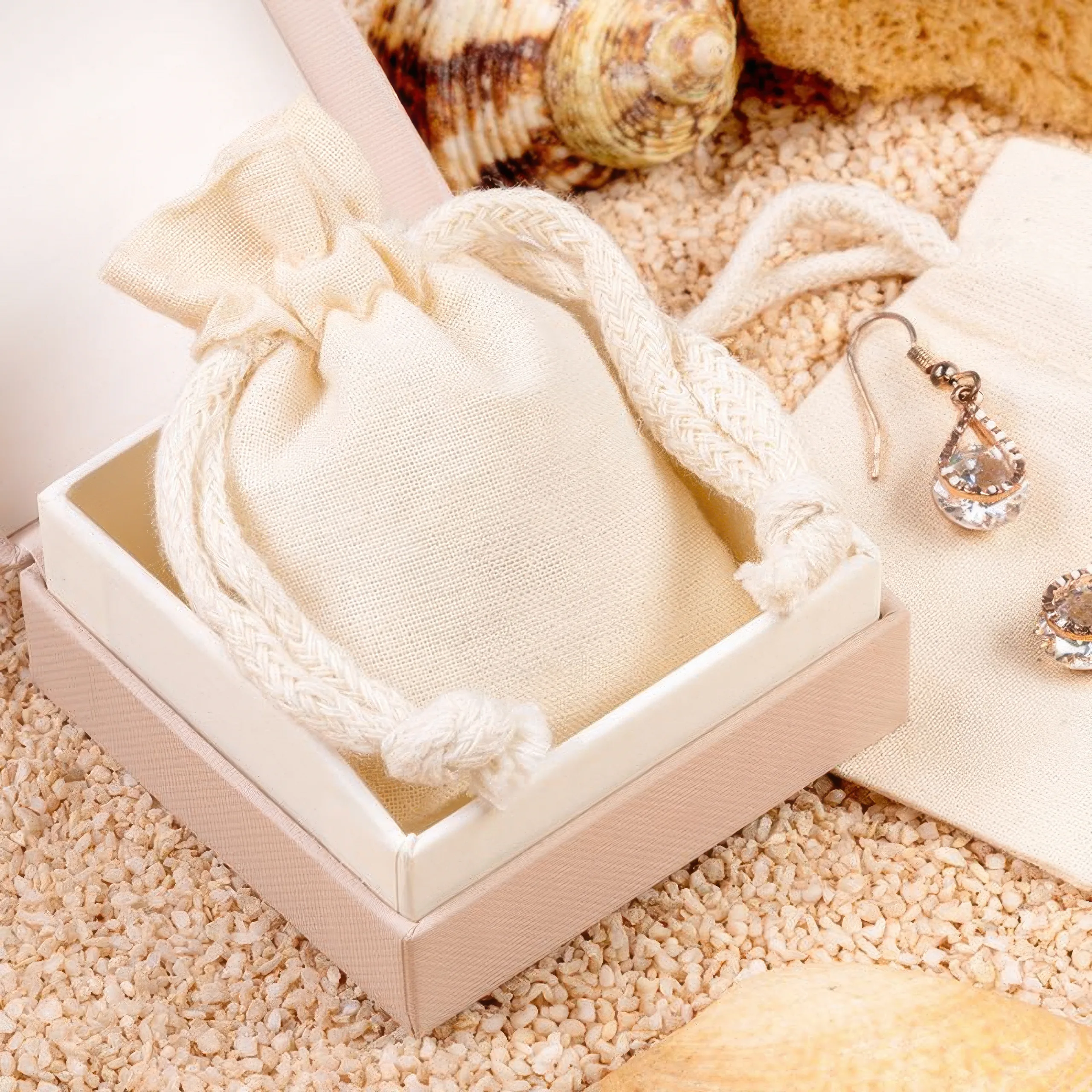 Her kan du købe smukke, genanvendelige poser syet af 100% bomuld i naturlige farver. Brug dem, som du vil - som en takkepakke til dine gæster (rustik eller boho bordpynt), produktemballage eller en lille gavepose til gaver. De små poser i ren bomuld er også perfekte som smykkeemballage.