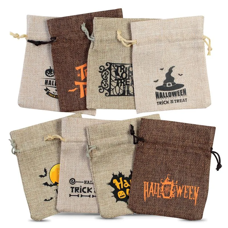 Sæt med 10 poser af jute, der måler 12 x 15 cm . Alle poser har dekorative prints med Halloween-temaer (pakken indeholder en tilfældig blanding af design og farver).
