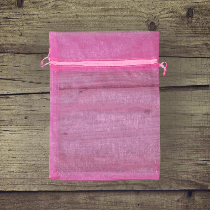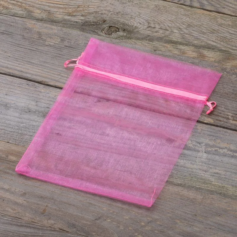 Sæt med 10 mellemstore organzaposer i pink, der måler 15 cm x 20 cm. De kaldes også for tylposer eller tylposer.