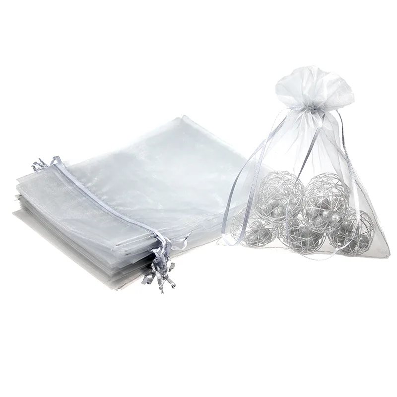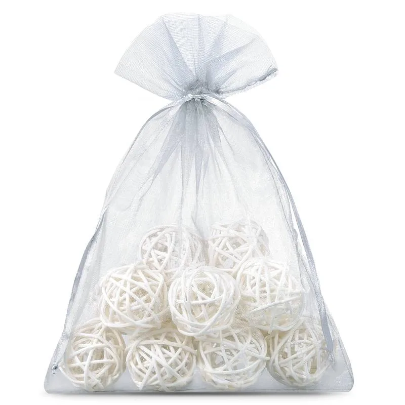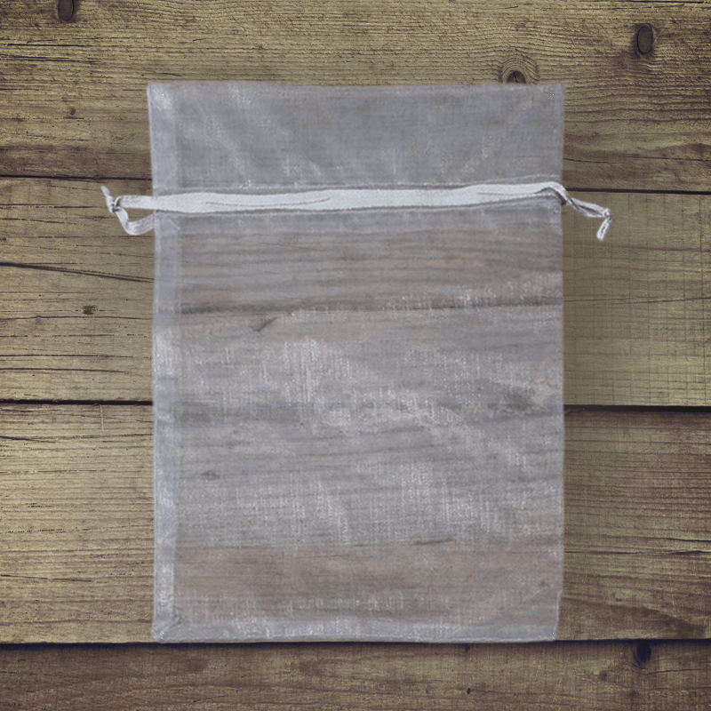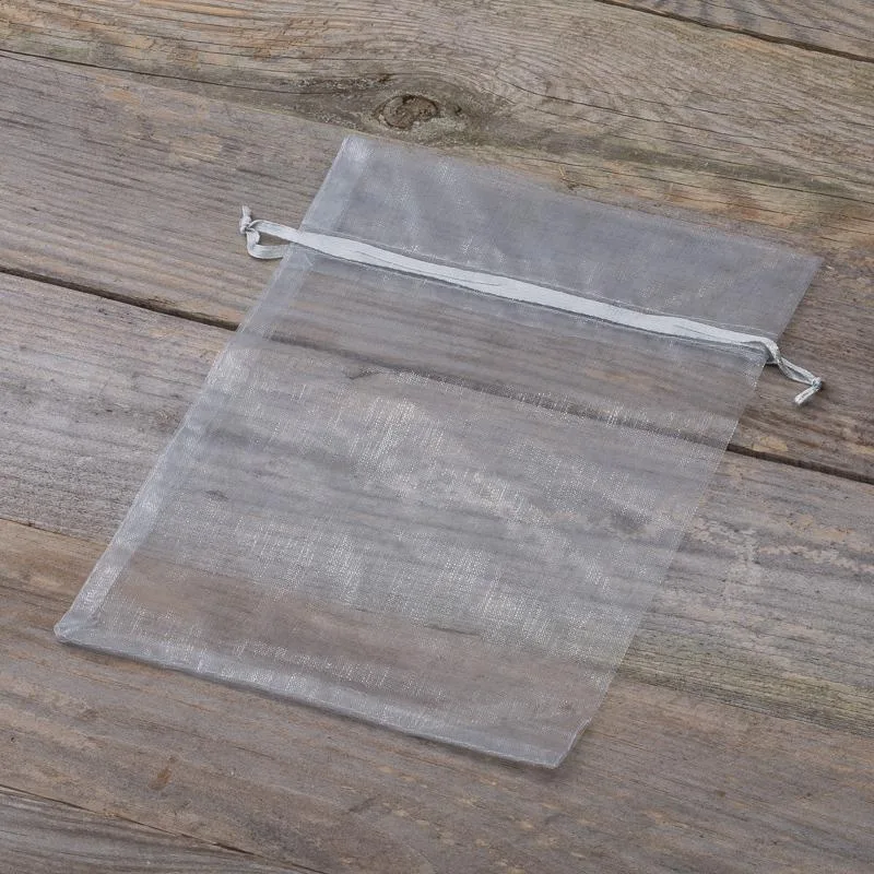 Sæt med 10 mellemstore organza-poser i sølv, der måler 15 cm x 20 cm. De kaldes også for tylposer eller tylposer.