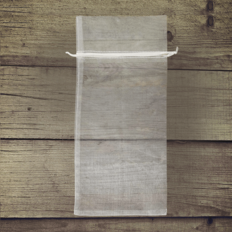 Sæt med 10 mellemstore organza-poser i ecru farve, der måler 15 cm x 33 cm. De kaldes også for tylposer eller tylposer.
