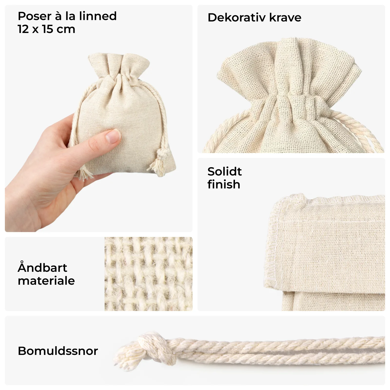 Linned-efterligningsposerne leveres med et hurtigt lukningssystem ved hjælp af en praktisk snor med dekorativt mønster. Vi har sikret, at vores små linneposer ikke kun er funktionelle, men også omhyggeligt udført ned til mindste detalje. Derfor er de velegnede til opbevaring af små genstande og indpakning af gaver.