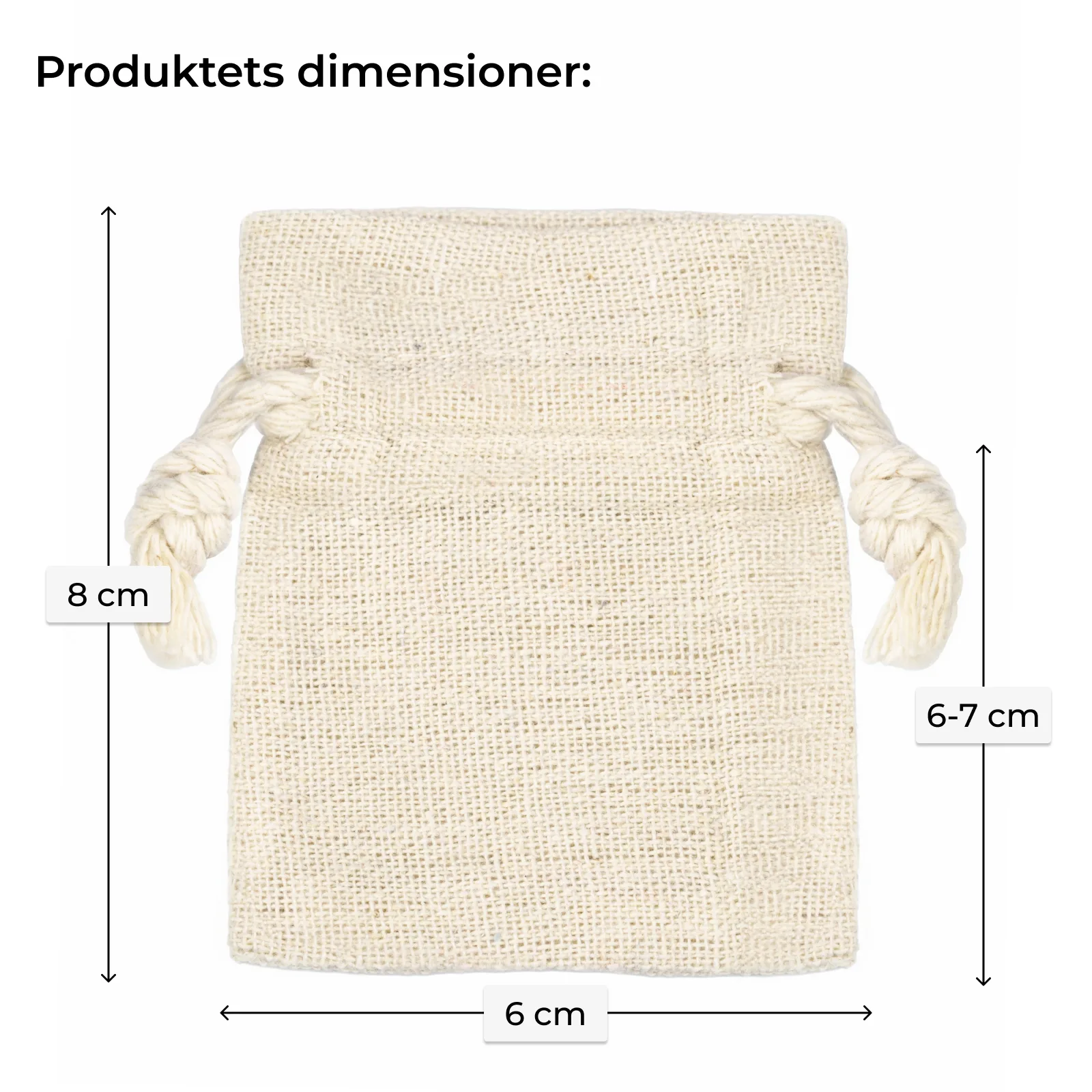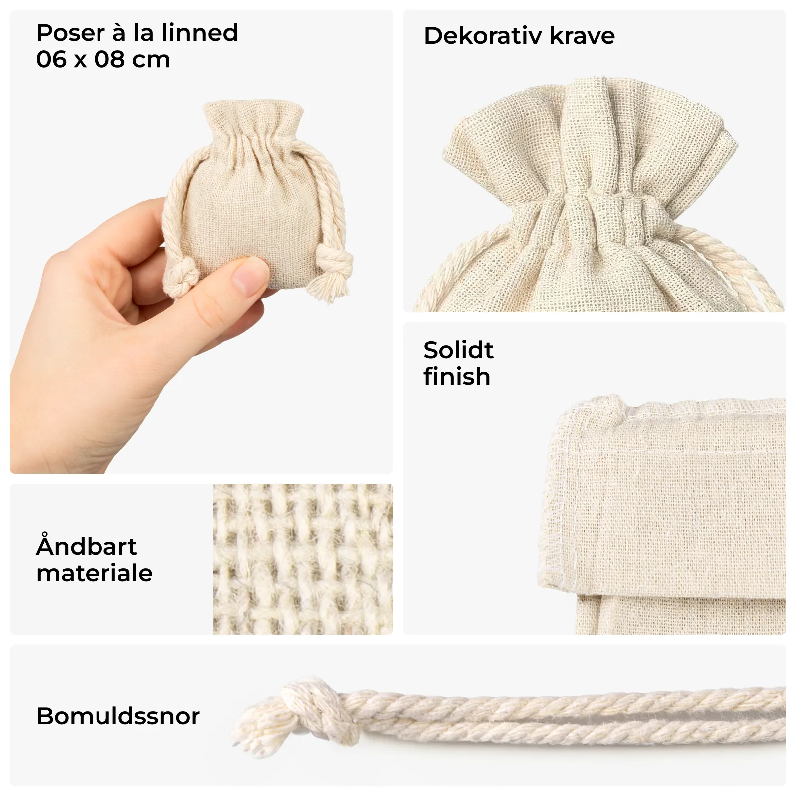 Oplev holdbare og praktiske stofposer i naturligt hør. De små poser, der præsenteres her, måler 6 x 8 cm. Pakken indeholder et sæt med 10 universalposer.
