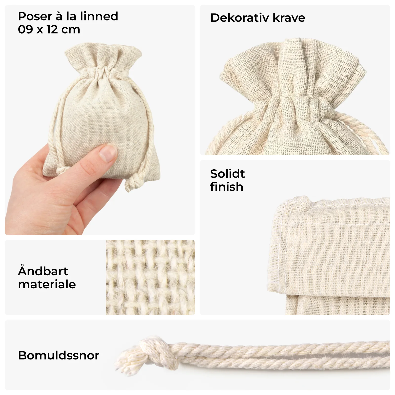 Oplev holdbare og praktiske stofposer i naturligt hør. De små poser, der præsenteres her, måler 9 x 12 cm. Pakken indeholder et sæt med 10 universalposer.
