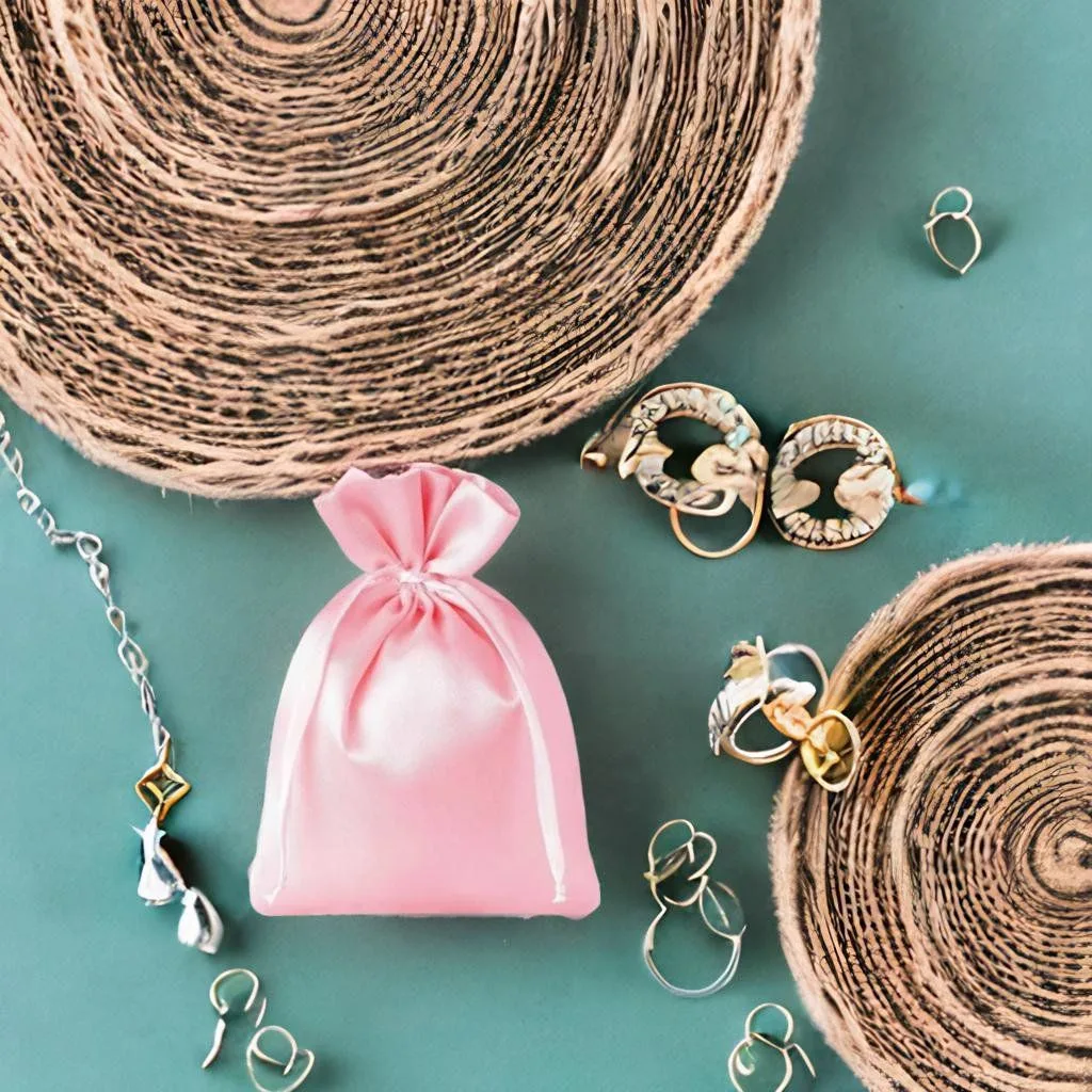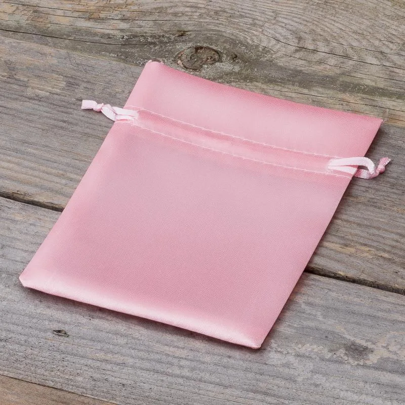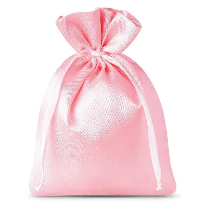 En samling af 10 dekorative poser i lyserødt satin, der måler 10 x 13 cm.
