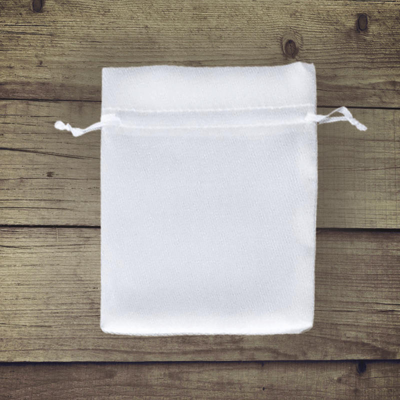 En samling af dekorative 12 x 15 cm hvide satinposer i et antal på 10 stk.