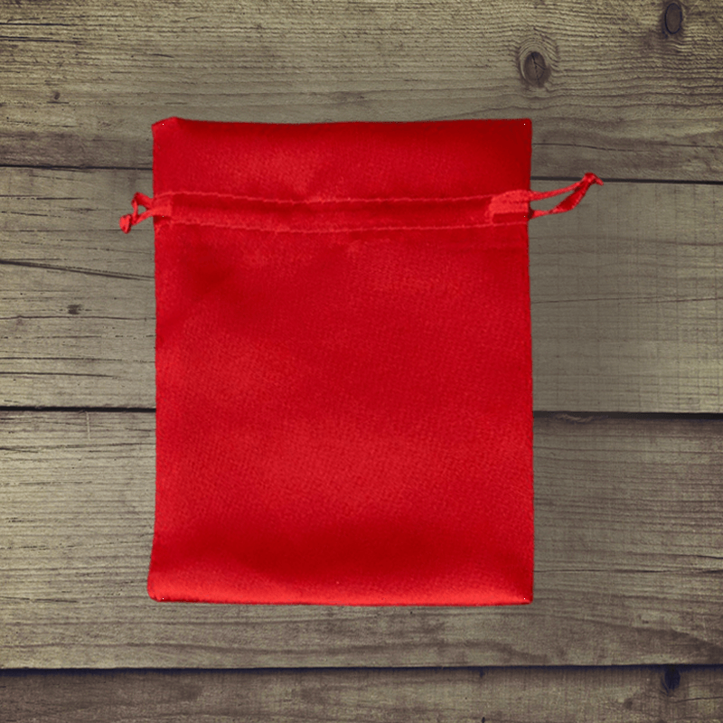 En samling af dekorative røde satinposer på 12 x 15 cm i et antal på 10 stk.