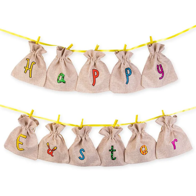 Påskeguirlanden består af 11 juteposer i naturlig lys farve, der måler 12 x 15 cm. Hver pose har et farverigt print med individuelle dekorative bogstaver, og poserne udgør indskriften: Glædelig påske. Hele sættet skal anbringes i to rækker.