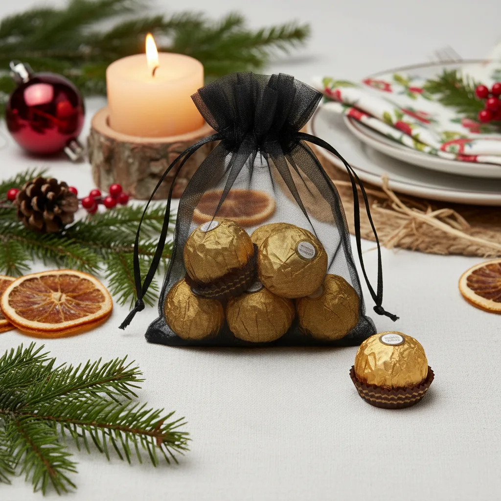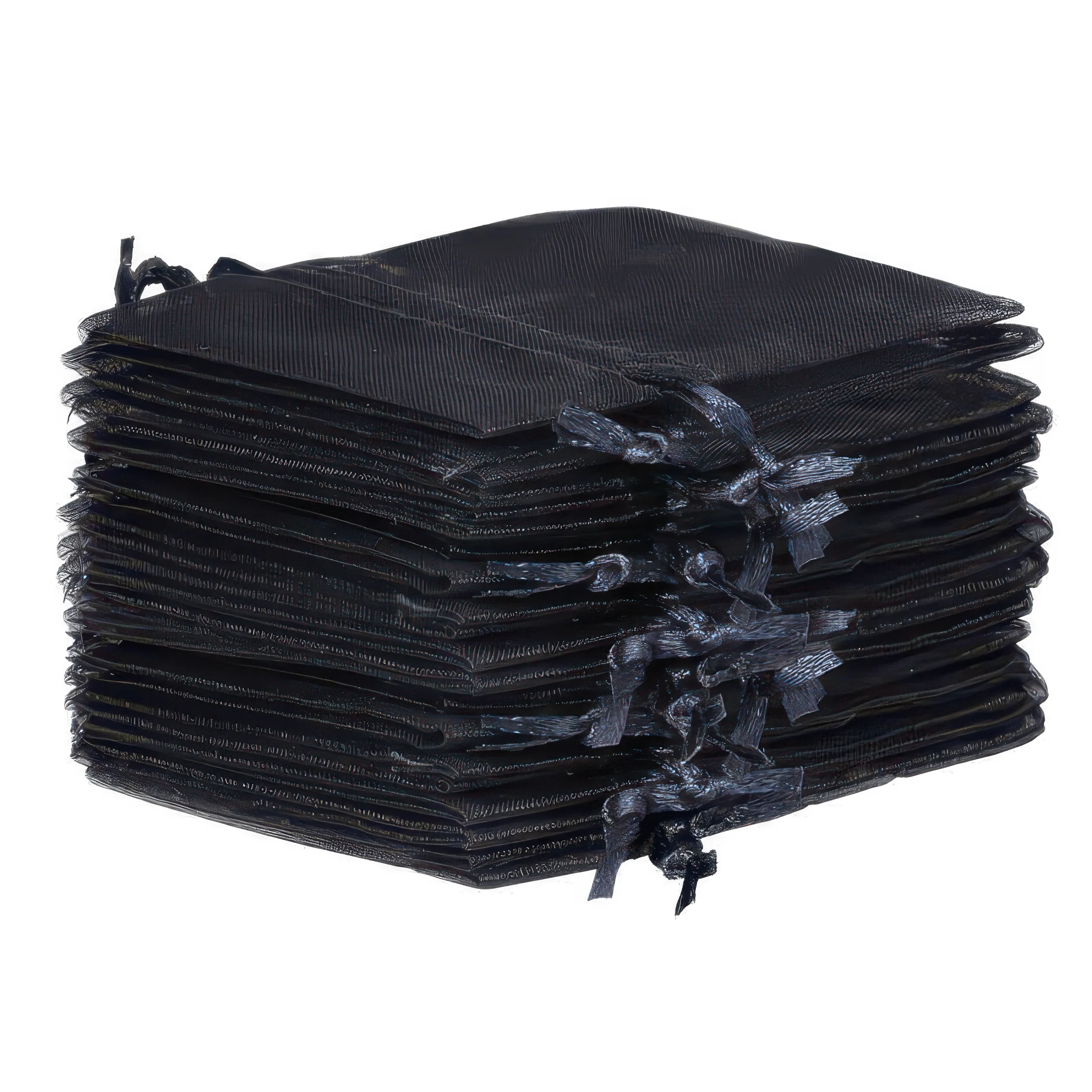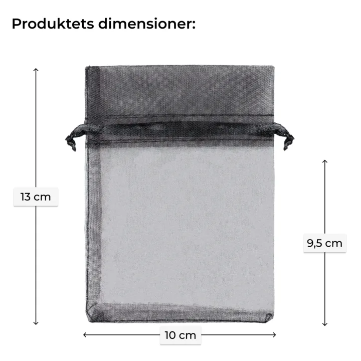 Et sæt små organzaposer i sort, der måler 10 cm x 13 cm. Denne praktiske pakke indeholder 25 stk., så et enkelt køb rækker i lang tid.