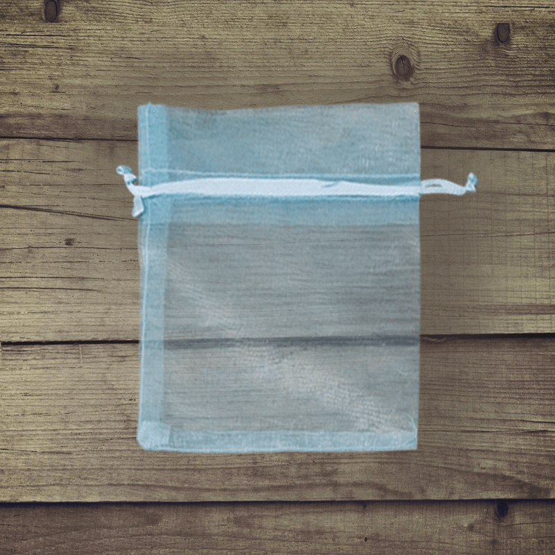 Sæt med 25 mellemstore organza-poser i blå, der måler 12 cm x 15 cm. De kaldes også for tylposer eller tylposer.