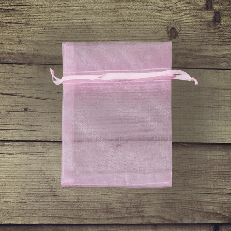 Sæt med 25 mellemstore organza-poser i lyserød, der måler 12 cm x 15 cm. De kaldes også for tylposer eller tylposer.