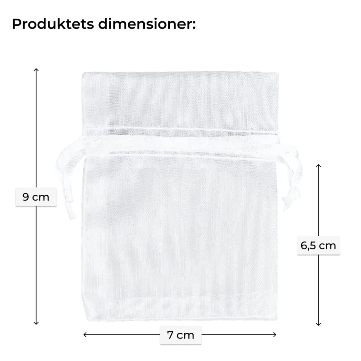 Et praktisk sæt små organza-poser, der måler 7 cm x 9 cm. Pakken indeholder 25 stk. i hvid, så der er masser af plads til småting. Vi kan også lave poserne med tryk ved at tilføje dit logo direkte på materialet - du skal blot kontakte os.