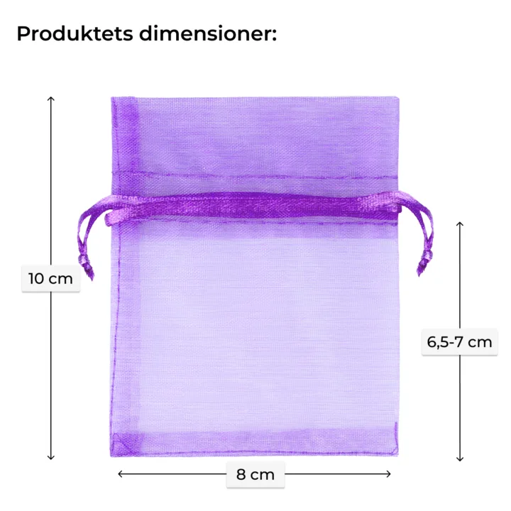 Denne praktiske sæt af små organza poser måler 8 cm x 10 cm. Pakken indeholder 25 stykker i en mørk lilla farve, der giver masser af plads til små genstande. Vi kan også lave poser med print ved at tilføje din logo direkte på materialet - kontakt os blot for mere information.