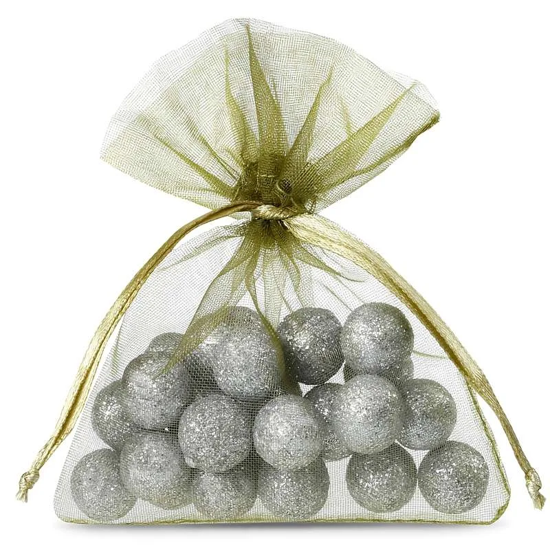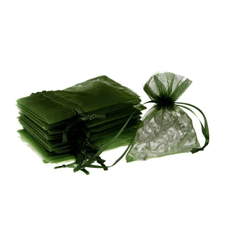Et sæt små organza-poser i olivengrøn, der måler 8 cm x 10 cm. Denne praktiske pakke indeholder 25 stk., så et enkelt køb rækker i lang tid.