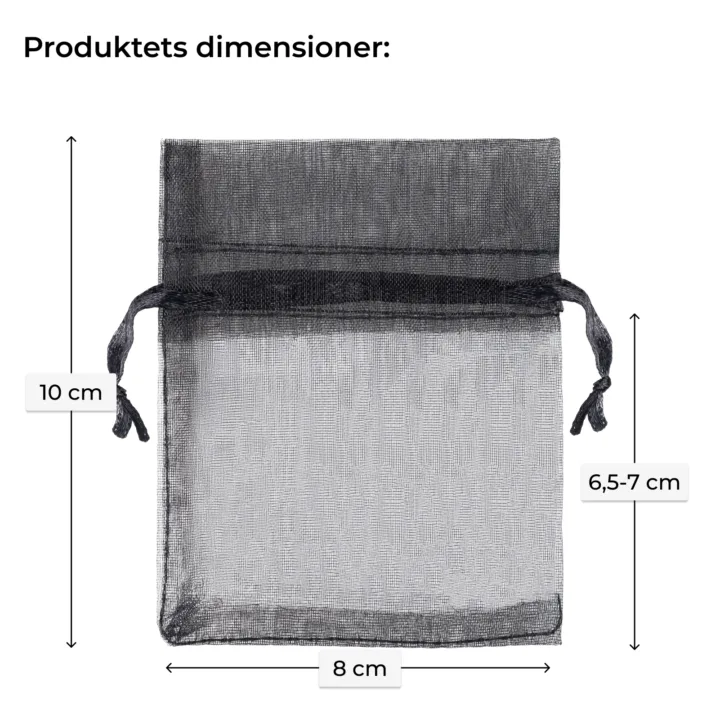 Et praktisk sæt små organza-poser, der måler 8 cm x 10 cm. Pakken indeholder 25 stk. i sort, hvilket giver masser af plads til småting. Vi kan også lave poserne med tryk ved at tilføje dit logo direkte på materialet - du skal blot kontakte os.
