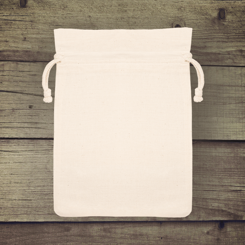 En robust og praktisk bomuldspose med dimensionerne 26 x 35 cm, lukket med en naturlig snor.