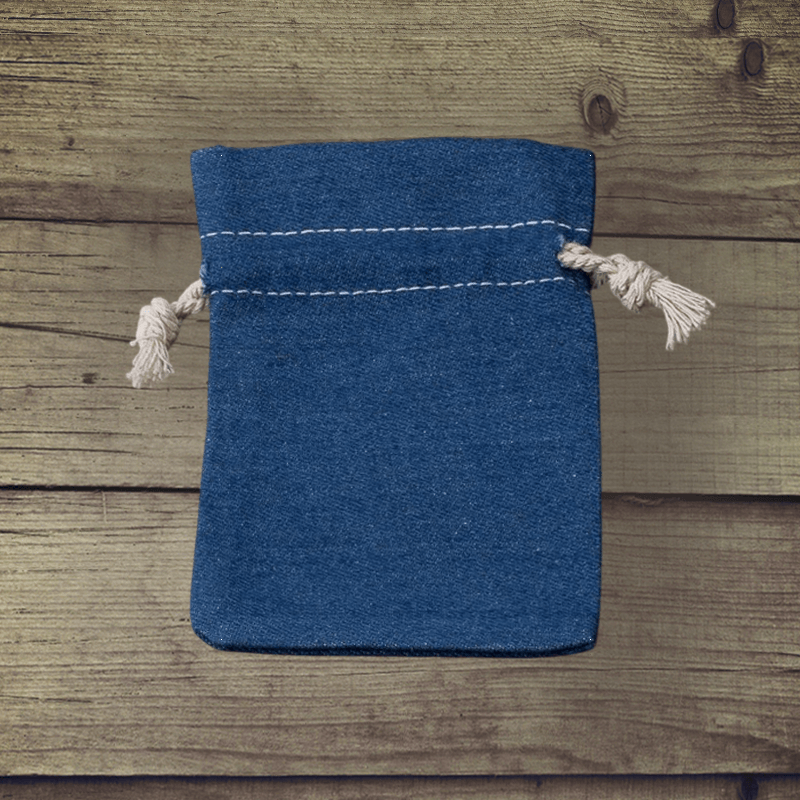 Et sæt af 3 poser lavet af originalt denimstof, størrelse 12 x 15 cm, hvis blå farve passer perfekt til ethvert sted. Dette sæt er meget alsidigt, da det gør det muligt at bruge poserne på mange forskellige måder.