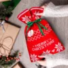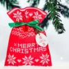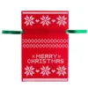 De røde poser med hvidt tryk i form af en juletrøje med teksten "Merry Christmas" og grønt satinbånd giver et gennemført og professionelt udtryk - ideelt til sæsonkampagner, butikker og firmagaver.
