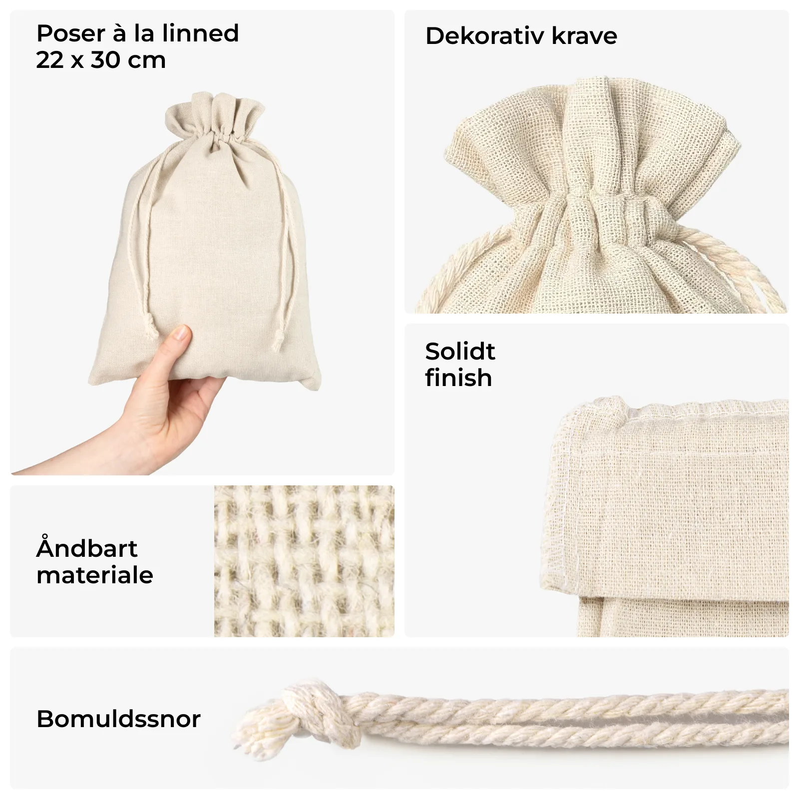 Oplev slidstærke og praktiske stofposer i naturligt linned. De små poser, der præsenteres her, måler 22 x 30 cm. Pakken indeholder et sæt med 3 universalposer.