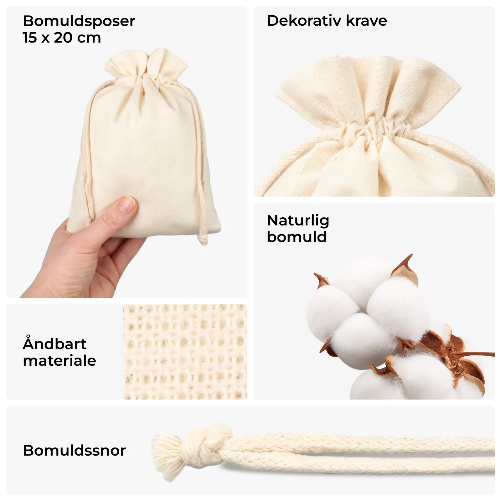 Bomuld er et klassisk stof, som altid ser elegant ud og også udmærker sig ved sin holdbarhed. Bomuldsposer er alsidige, så de er perfekte til enhver situation.