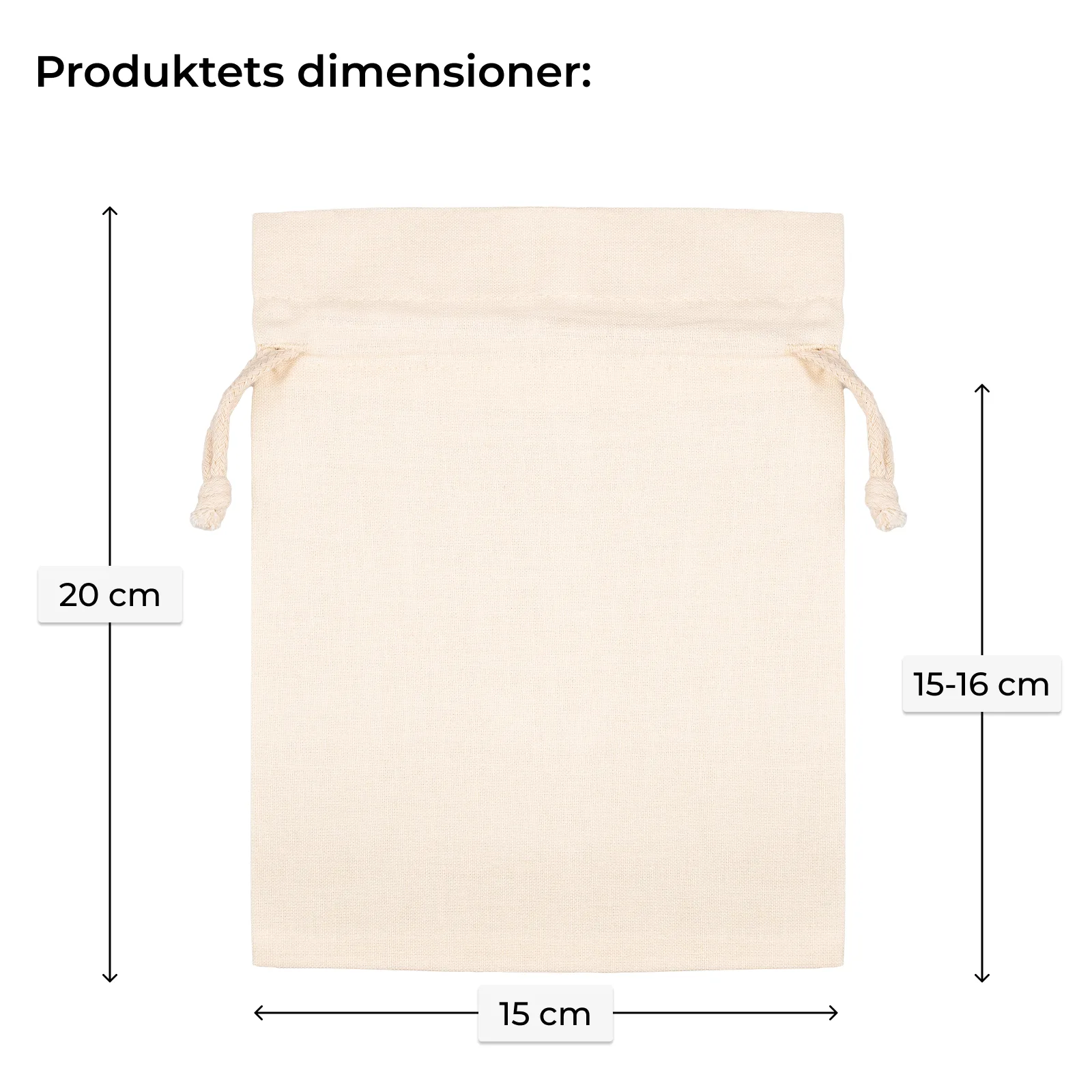 En robust og praktisk bomuldspose på 15 x 20 cm, der er trukket med naturlig snor. Vi sælger 5 stk. i denne serie.