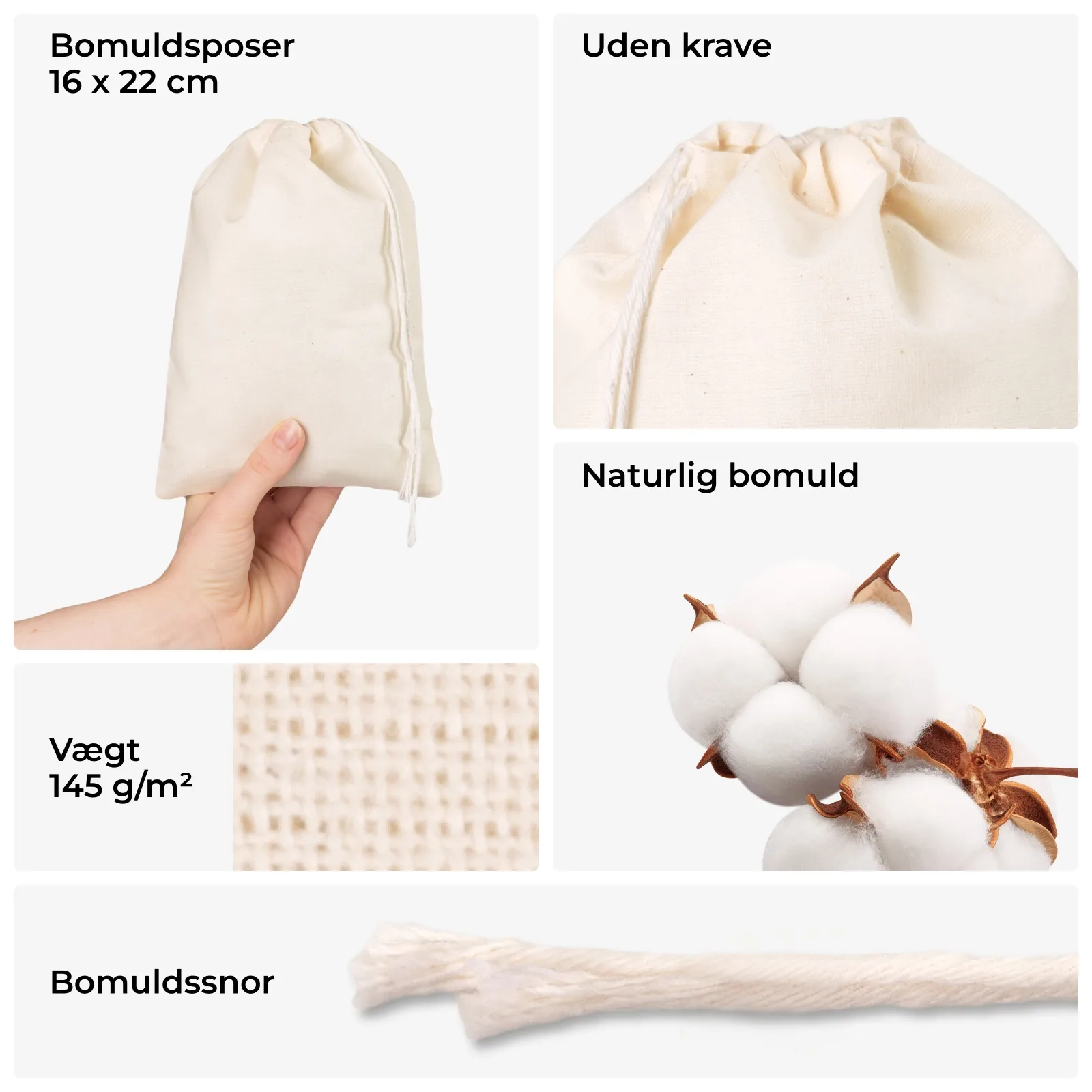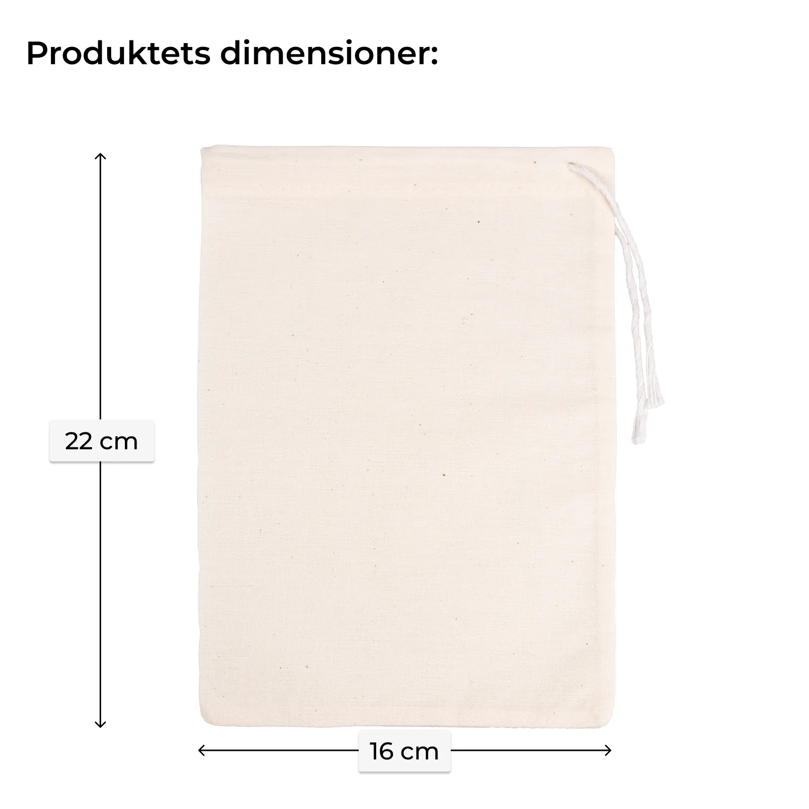 - Bæredygtige: 100% naturbomuld - et alternativ til plast,