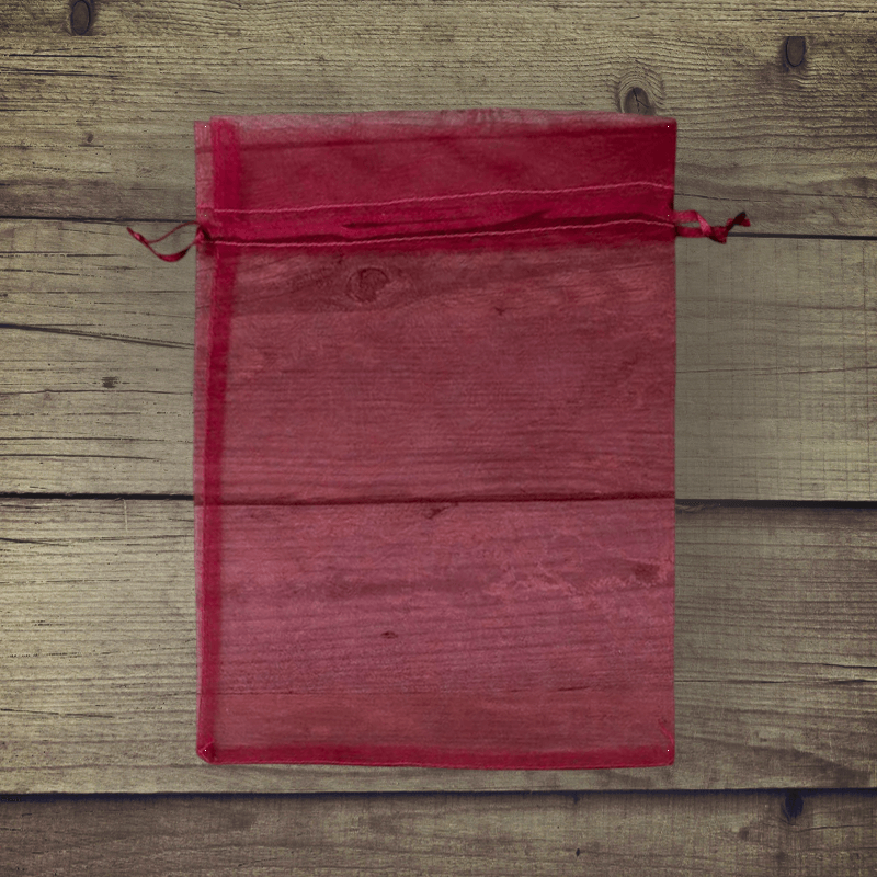 Pakke med 5 store organza-poser i bordeauxrød, der måler 40 cm x 55 cm.