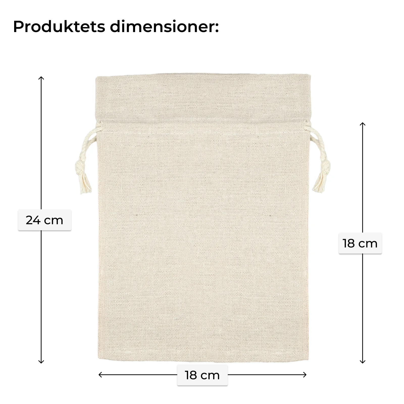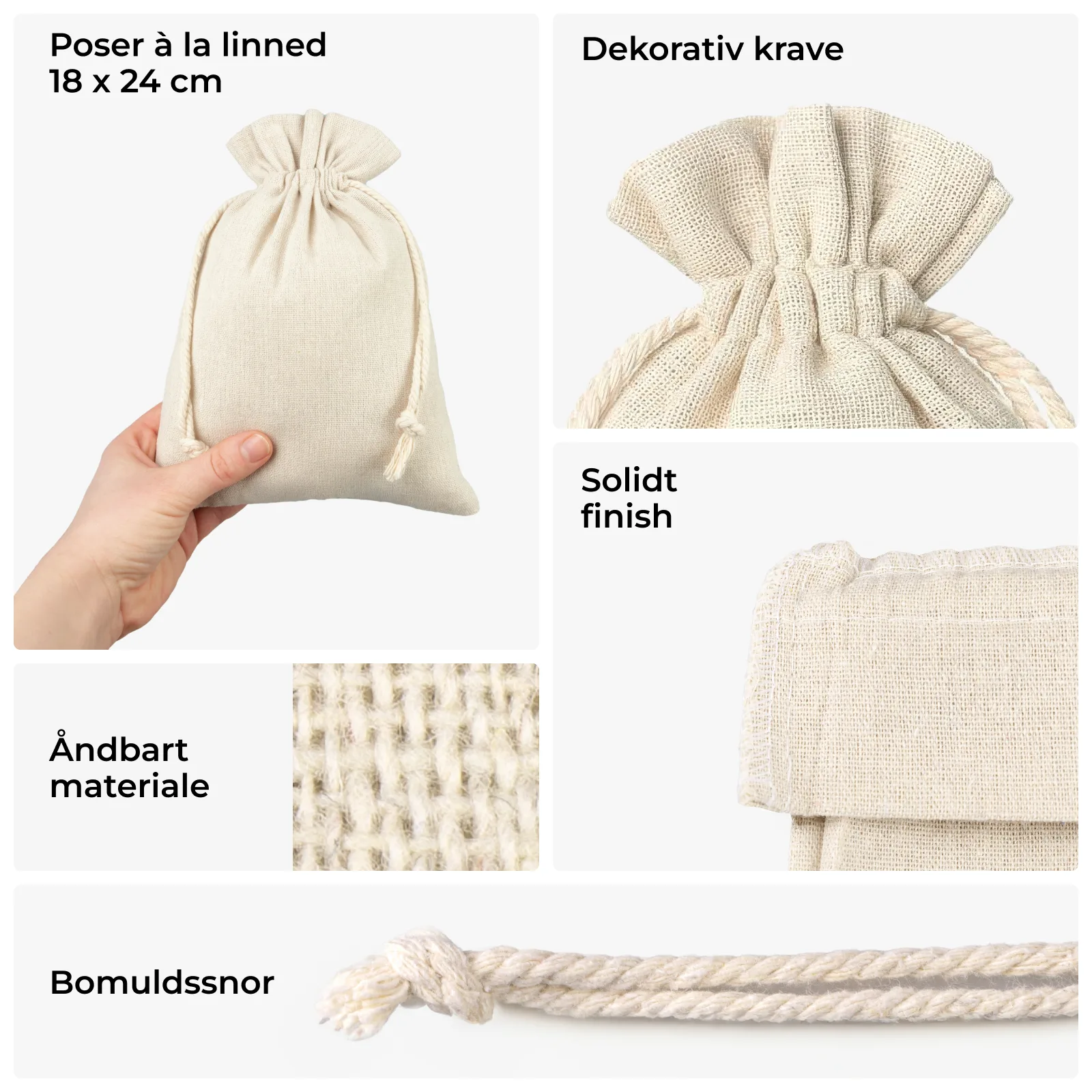 Oplev holdbare og praktiske stofposer i naturligt hør. De små poser, der præsenteres her, måler 18 x 24 cm. Pakken indeholder et sæt med 5 universalposer.