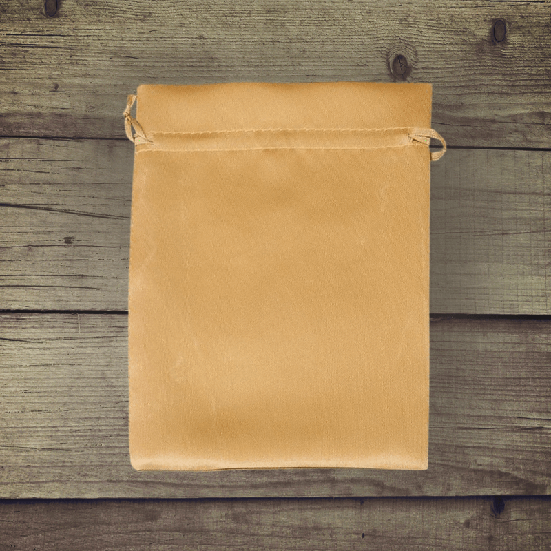 Pakke med 5 dekorative satinposer i guld, der måler 15 x 20 cm.