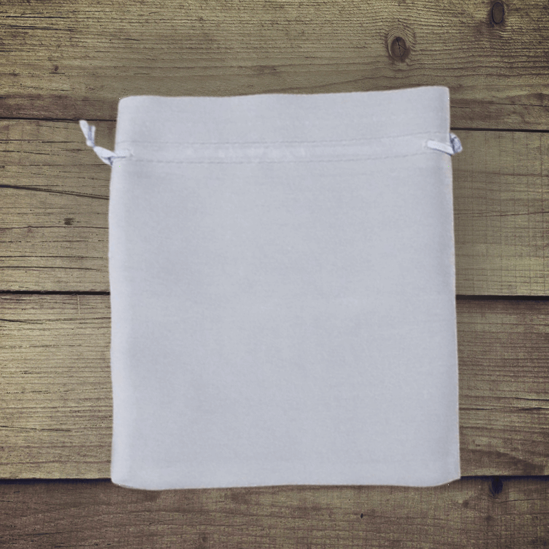 Pakke med 5 dekorative satinposer i sølv, der måler 15 x 20 cm.