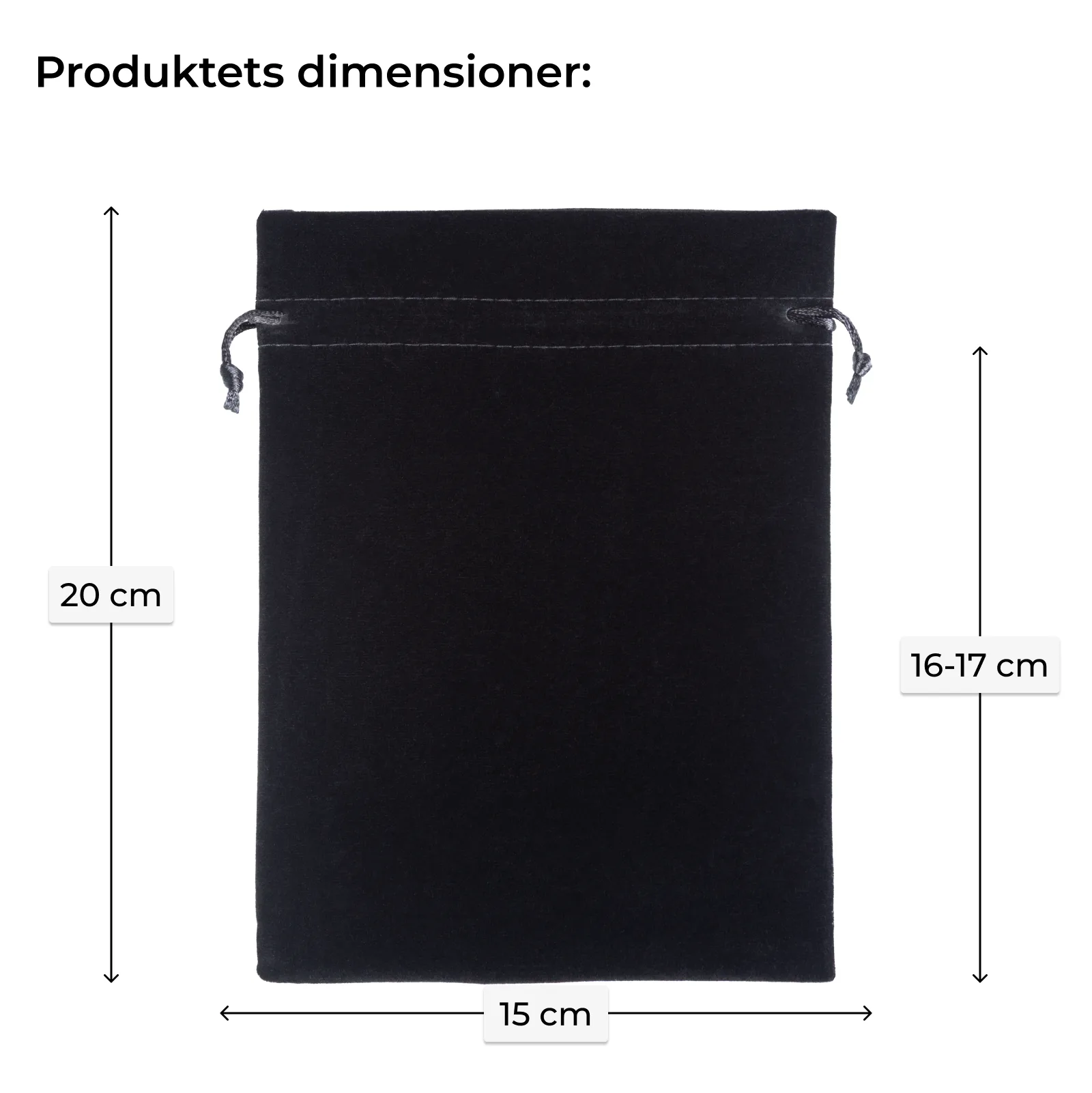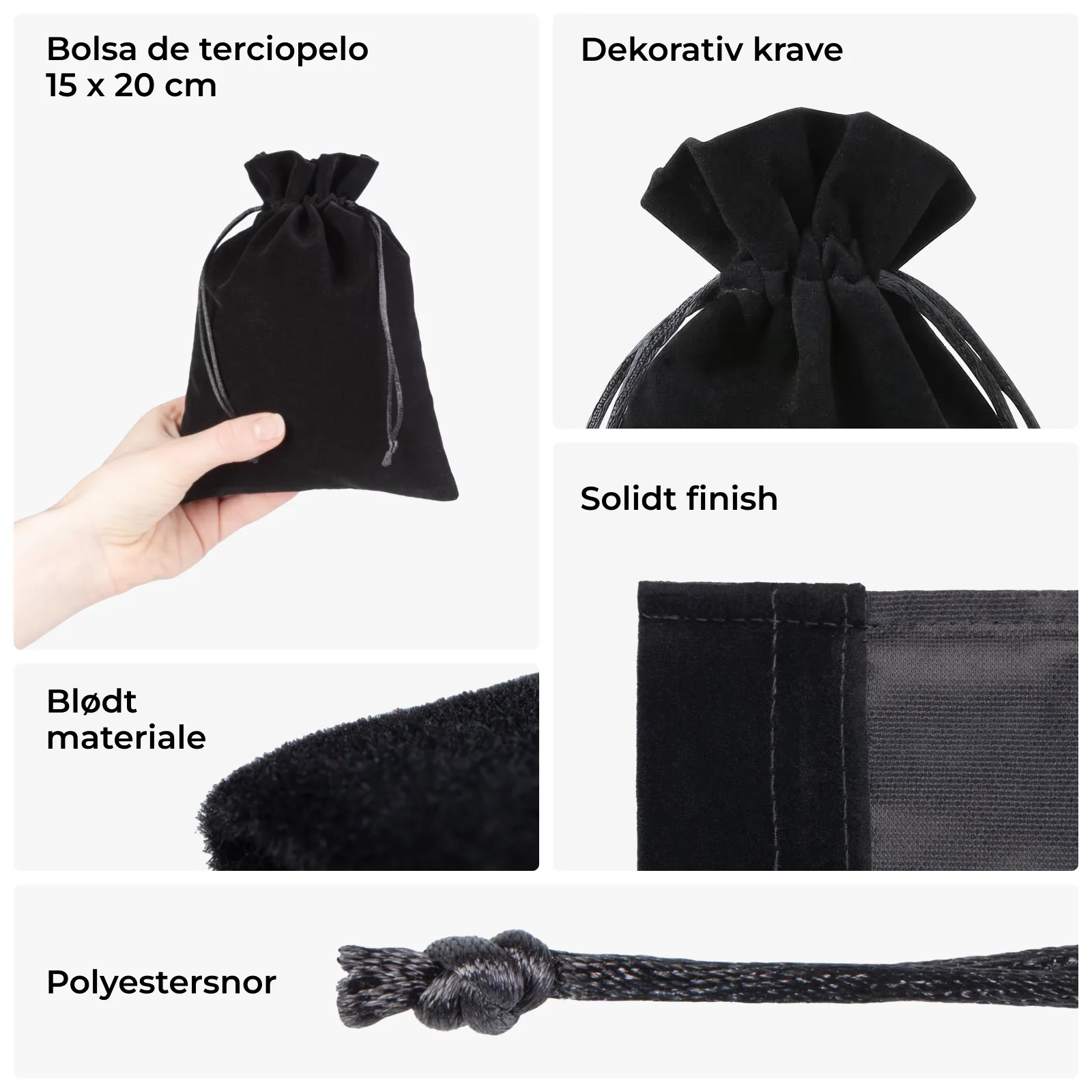 Sættet indeholder 5 stykker sorte fløjlposer på 15 x 20 cm. Er du på udkig efter en anden farve eller størrelse? Opdag hele kollektionen af fløjlposer, der er tilgængelige i vores butik!