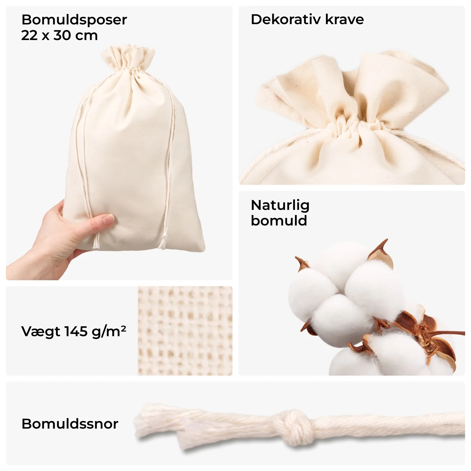 Vores stofposer er fremstillet af naturligt, ufarvet bomuldsstof med høj holdbarhed og åndbarhed. De kan bruges igen og igen og passer perfekt til virksomheder, der ønsker at understrege deres bæredygtige profil.