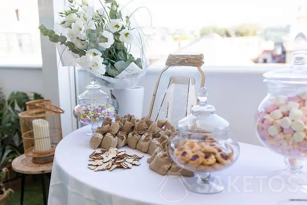 - Blomsterdekorationer - ud over de blomsterbuketter og traditionelle guirlander, der blev sat på bordene, var vi begejstrede for ideen om at bruge en bomuldspose som et alternativ til en vase. Vi synes, at det er en vidunderlig og meget original idé. Perfekt til dekorationer under et udendørs bryllup!