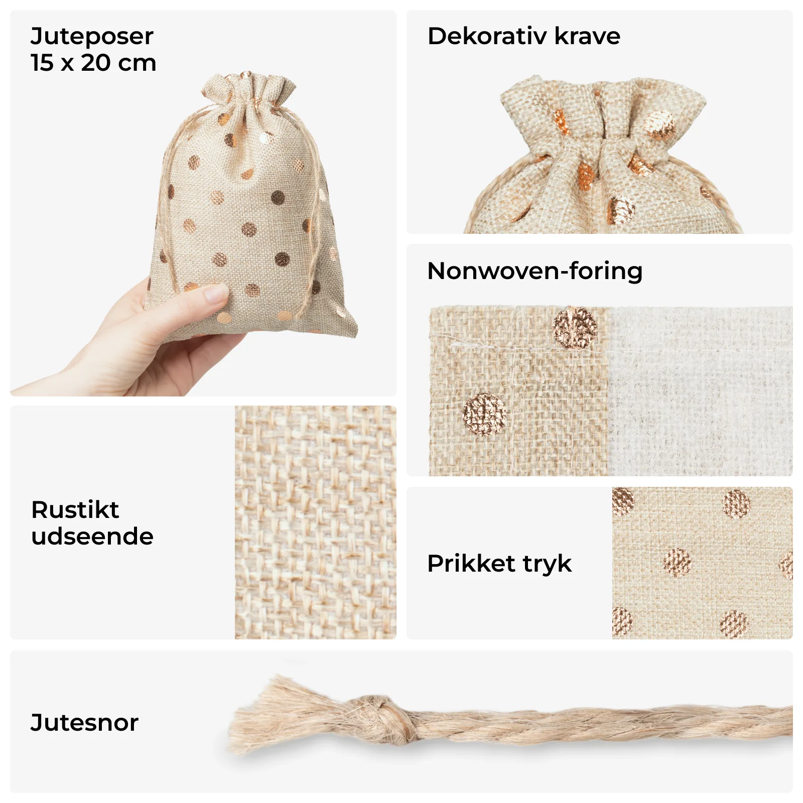 - Materiale: Jutelignende stof - som ligner ægte jute i udseende og struktur.