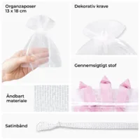 Uanset om du arrangerer en fødselsdag, et firmaarrangement, et bryllup eller en kommunionsfest, vil du helt sikkert gerne skabe elegante borddekorationer. Ved hjælp af hvide organza-poser, som også fungerer godt som bestikæsker eller vignetter. Du kan også pakke små gaver til dine gæster ind i dem og derefter placere dem ved siden af tallerknerne. Poserne kan indeholde slikkepinde, fudge, praliner eller duftende sæber. Hvis du arrangerer en barnedåb eller kommunion, kan du overveje at pakke nøgleringe med et englebillede eller bibelske citater i dem. De kan så klikkes fast på din rygsæk eller håndpose. Vi forsikrer dig om, at de vil appellere til folk i alle aldre!