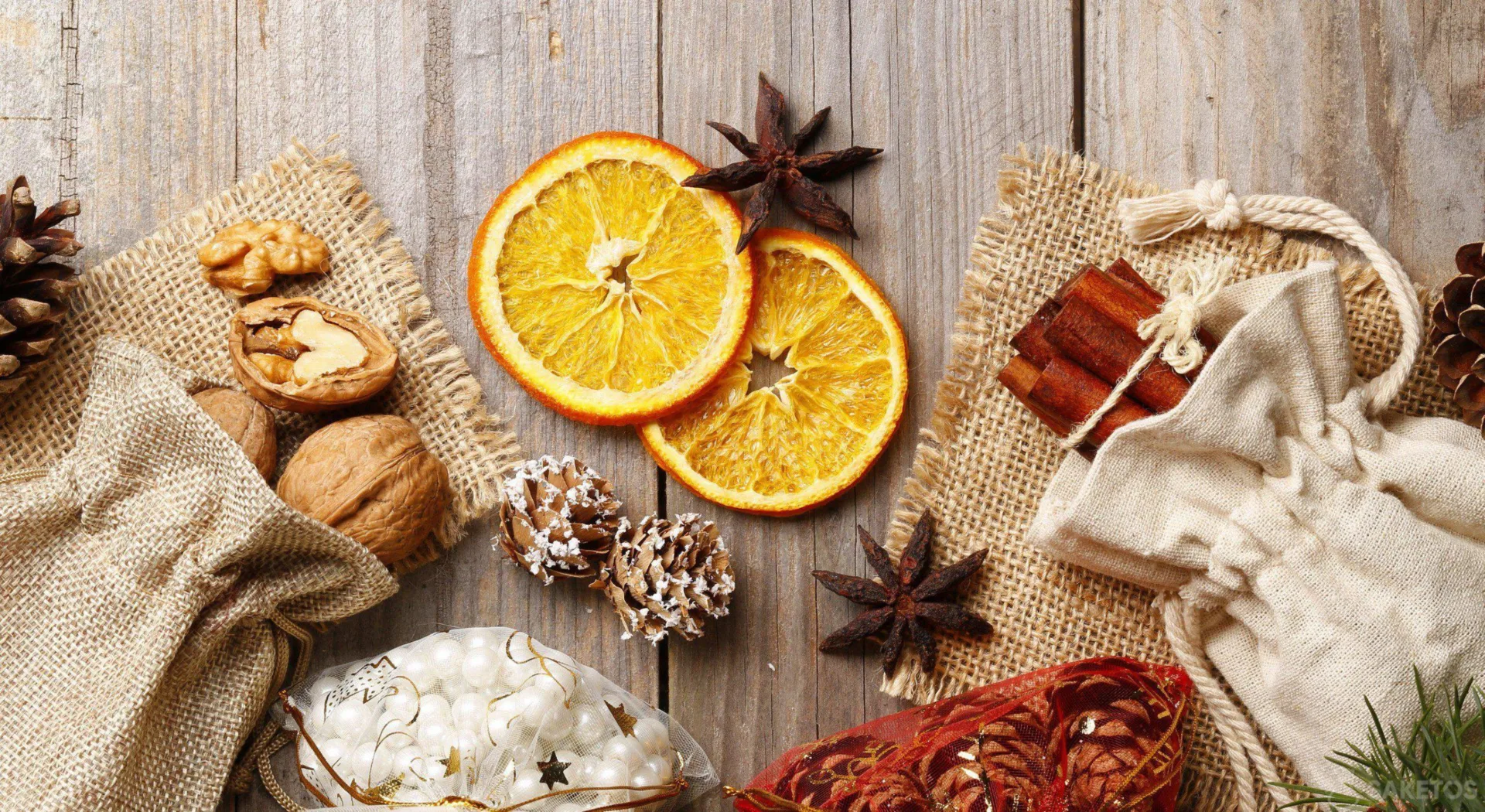 En hør- eller organzapose fyldt med appelsiner, kanel eller nødder vil give rummet en unik festlig aura. Du kan også bruge poserne til at dække en potte med en lille plante eller et lille træ.