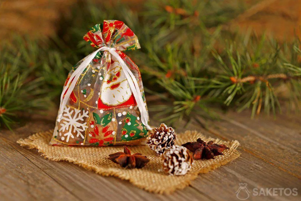 En hør- eller organzapose fyldt med appelsiner, kanel eller nødder vil give rummet en unik festlig aura. Du kan også bruge poserne til at dække en potte med en lille plante eller et lille træ.